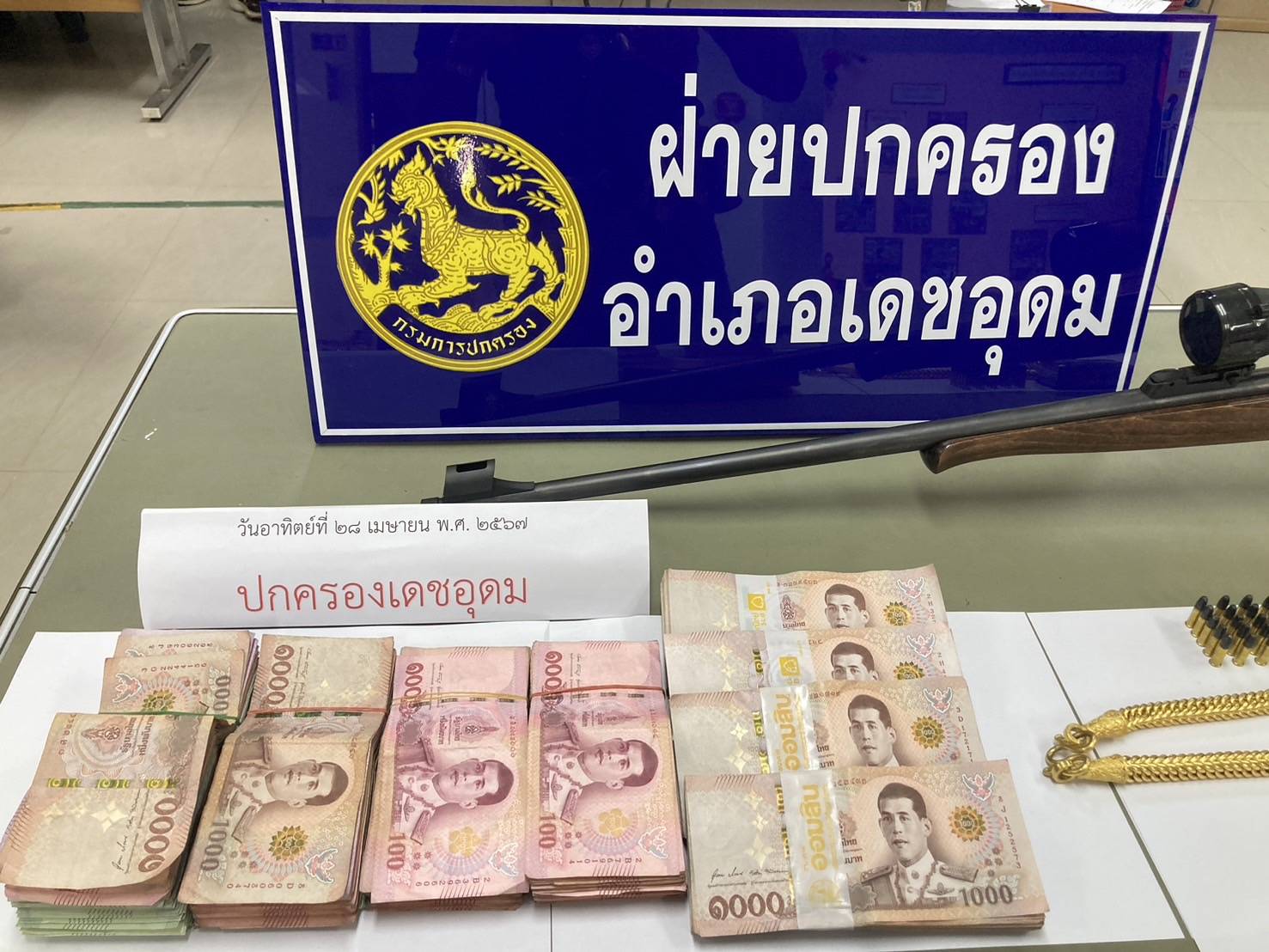 ดำเนินการตรวจค้นบ้าน นายริท หมู่ที่ 9 บ้านคำนาแซง ตำบลกุดประทาย ซึ่งเป็นเป้าหมายตามบัญชีพ่อค้ายาเสพติดของจังหวัดอุบลราชธานี แต่นายริท ไหวตัวทันหลบหนีไปได้ โดยเจ้าหน้าที่ทำการตรวจยึดอายัด ของกลาง เป็นสร้อยคอทองคำน้ำหนัก 10 บาท , สร้อยข้อมือทองคำน้ำหนัก 10 บาท , อาวุธปืนยาวขนาด .22 CZ จำนวน 1 กระบอก , ซองบรรจุกระสุนพร้อมเครื่องกระสุนจำนวน 25 นัด , เงินสด 440,000 บาท รวมจำนวนทรัพย์สิน 1,304,000 บาท ซึ่งสันนิษฐานว่าทรัพย์สินดังกล่าวได้มาจากการจำหน่ายยาเสพติด เจ้าหน้าจึงได้จัดทำบันทึกตรวจยึดเพื่อทำการตรวจสอบหาข้อเท็จจริงต่อไป