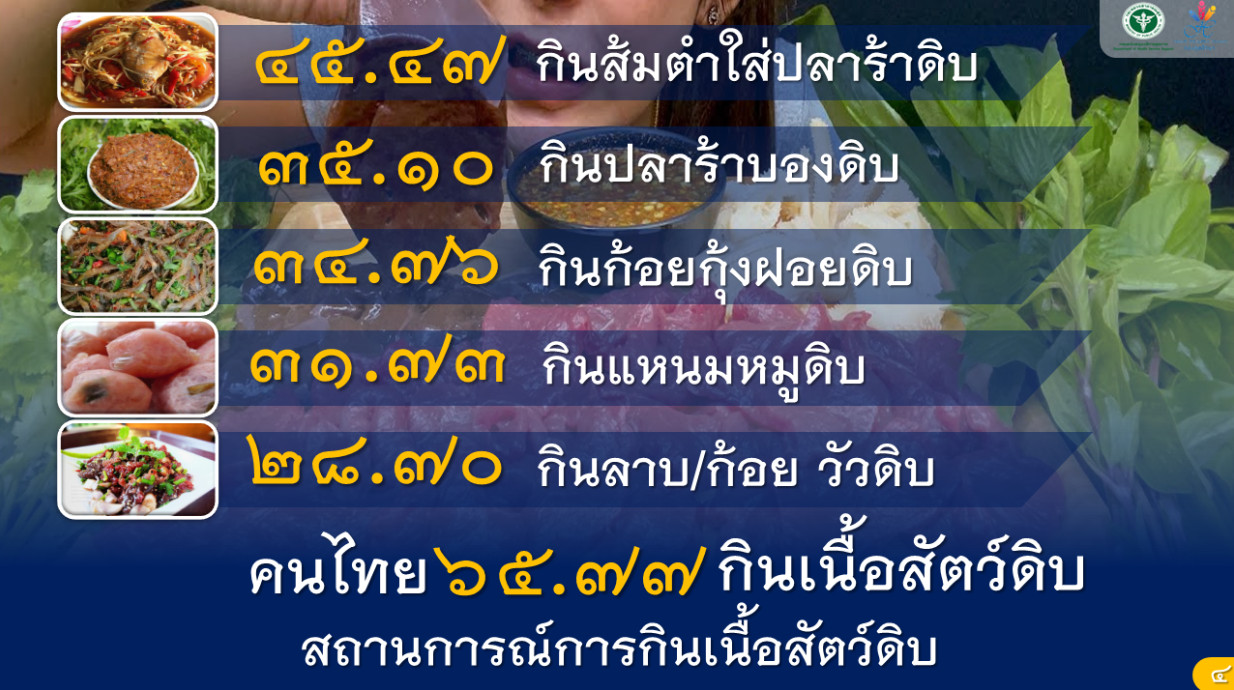 นพ.สุระ วิเศษศักดิ์ อธิบดีกรม สบส. กล่าวว่า จากการเฝ้าระวังพฤติกรรมสุขภาพ ระหว่างวันที่ 13 – 29 กุมภาพันธ์ 2567 ในกลุ่มวัยทำงาน โดยกองสุขศึกษา กรม สบส. ร่วมกับเครือข่ายเฝ้าระวังพฤติกรรมผ่านระบบออนไลน์ พบว่า ผู้ตอบแบบเฝ้าระวังฯ จำนวน 16,517 ราย เป็นประชากรภาคอีสาน ร้อยละ 58.50 ภาคเหนือ ร้อยละ 19.17 ภาคกลาง ร้อยละ 17.42 กรุงเทพมหานคร ร้อยละ 3.49 และภาคใต้ ร้อยละ 1.40 ส่วนใหญ่เป็นผู้ประกอบอาชีพเกษตรกร ร้อยละ 48.45 มีพฤติกรรมการกินอาหารที่ทำจากเนื้อสัตว์ดิบ เช่น เนื้อวัว เนื้อหมู สัตว์น้ำจืด และสัตว์ทะเล ร้อยละ 65.77 พื้นที่ที่มีความชุกของพฤติกรรมการกินอาหารปรุงไม่สุกมากที่สุด คือ ภาคอีสาน ร้อยละ 77.14 รองลงมา คือ ภาคเหนือ ร้อยละ 67.32 โดย 5 เมนูยอดฮิตพบว่านิยมกินมากที่สุด ได้แก่ ส้มตำใส่ปลาร้าดิบ ร้อยละ 45.47 รองลงมาปลาร้าบองดิบ ร้อยละ 35.10 ก้อยกุ้งฝอยดิบ 34.76 แหนมหมูดิบ 31.73 และลาบก้อยวัวดิบ ร้อยละ 28.70 อีกทั้ง คนที่มีความเชื่อว่าเนื้อดิบอร่อยกว่าเนื้อสุกจะมีโอกาสกินเนื้อดิบเป็น 4.21 เท่าของคนที่ไม่เชื่อในรสชาติดังกล่าว และการที่เคยเห็นคนดัง คนมีชื่อเสียงกินเนื้อดิบผ่านสื่อต่างๆ จะทำให้เกิดพฤติกรรมเลียนแบบ โดยมีโอกาสที่จะกินเนื้อดิบตามเป็น 1.34 เท่าเมื่อเทียบกับคนที่ไม่เคยเห็น ซึ่งกรม สบส.จะมอบหมายให้กองสุขศึกษาดำเนินการส่งเสริมความรอบรู้ด้านสุขภาพ (Health Literacy) แก่ประชาชนในระดับบุคคล ให้เกิดความเข้าถึง เข้าใจในข้อมูลสุขภาพ สามารถนำข้อมูลไปใช้ดูแลและรักษาสุขภาพของตนเองให้แข็งแรงตามช่วงวัยต่างๆ ทำให้สามารถประกอบกิจกรรมและการงานได้อย่างเข้มแข็ง