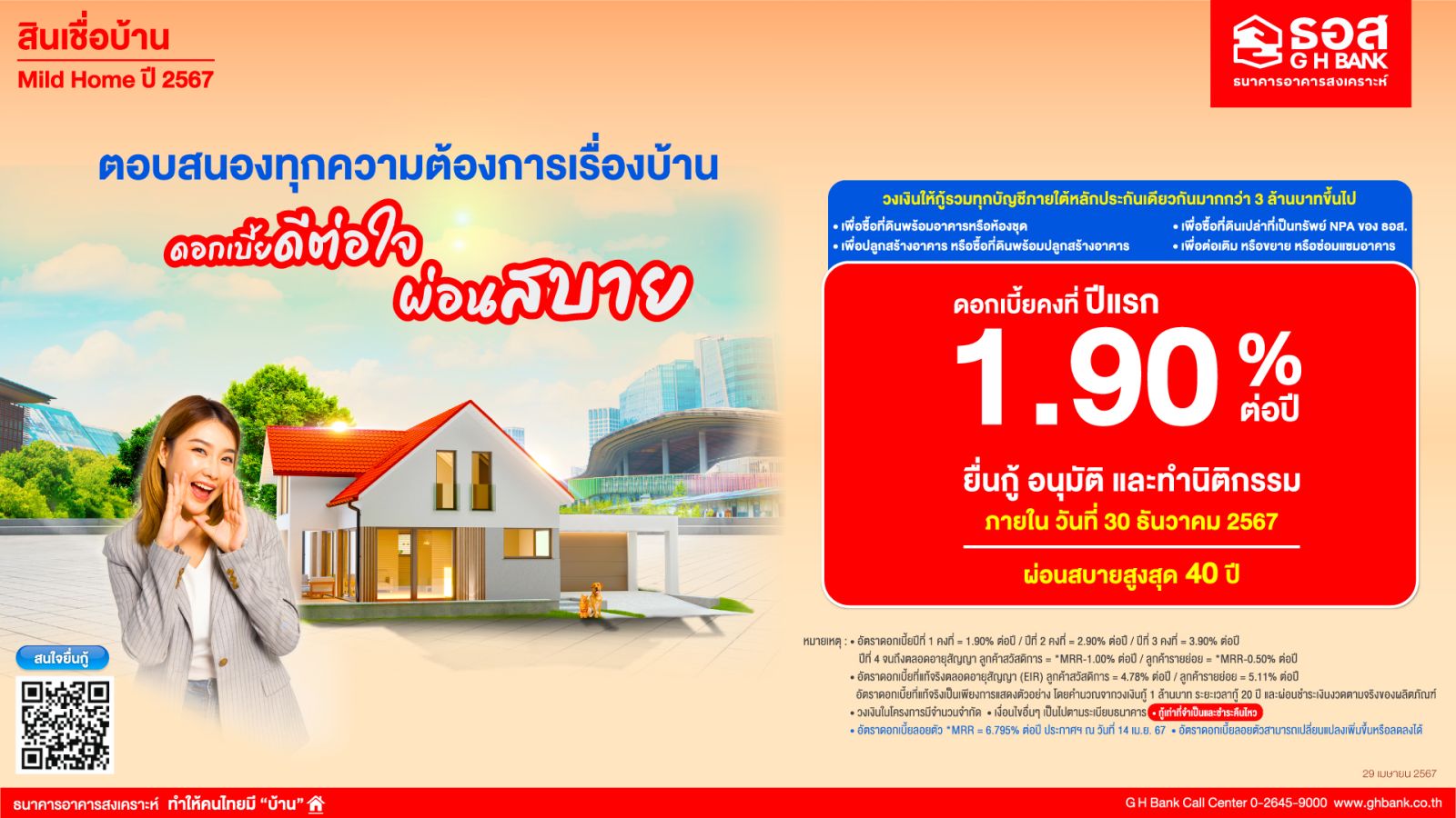 นายกมลภพ วีระพละ กรรมการผู้จัดการ ธนาคารอาคารสงเคราะห์ (ธอส.) เปิดเผยว่า หลังจาก ธอส. จัดทำโครงการสินเชื่อบ้าน Happy Home สำหรับผู้ที่ต้องการซื้อหรือปลูกสร้างที่อยู่อาศัยในระดับราคาไม่เกิน 3 ล้านบาท ผลปรากฏว่า มีผู้ที่สนใจรับรหัสเข้าร่วมโครงการแล้ว 8,321 ราย คิดเป็นวงเงินสินเชื่อมากกว่า 15,000 ล้านบาทสะท้อนถึงความต้องการที่อยู่อาศัยของลูกค้าประชาชนที่ยังมีอยู่เป็นจำนวนมาก แต่ด้วยปัจจุบันยังมีกลุ่มลูกค้าที่มีความต้องการที่อยู่อาศัยในระดับราคามากกว่า 3 ล้านบาทขึ้นไป ดังนั้น ธอส. ในฐานะสถาบันการเงินของรัฐ ที่มีพันธกิจ “ทำให้คนไทยมีบ้าน”จึงพร้อมสนับสนุนนโยบายรัฐบาลและกระทรวงการคลัง ในการส่งเสริมให้คนไทยทุกกลุ่มได้มีที่อยู่อาศัยเป็นของตนเอง ด้วยการจัดทำ “สินเชื่อ Mild Home” กรอบวงเงิน 10,000 ล้านบาท สำหรับผู้ที่ต้องการกู้เพื่อซื้อบ้านหรือคอนโด, ที่ดินเปล่า ที่เป็นทรัพย์ NPA ของ ธอส., ปลูกสร้าง, ต่อเติม และซ่อมแซม วงเงินกู้มากกว่า 3 ล้านบาทขึ้นไป คิดอัตราดอกเบี้ยปีแรกเพียง 1.90% ต่อปี, ปีที่ 2 เท่ากับ 2.90% ต่อปี, ปีที่ 3 เท่ากับ 3.90% ต่อปี เฉลี่ย 3 ปีแรก เพียง 2.90% และปีที่ 4 จนถึงตลอดอายุสัญญา กรณีลูกค้าสวัสดิการ เท่ากับ MRR-1.00% ต่อปี และกรณีลูกค้ารายย่อย เท่ากับ MRR-0.50% ต่อปี (อัตราดอกเบี้ย MRR ของ ธอส. ปัจจุบันเท่ากับ 6.795% ต่อปี) ระยะเวลาการกู้นานสูงสุด 40 ปี เงินงวดปีแรกเพียงล้านละ 2,500 บาทต่อเดือน เท่านั้น!