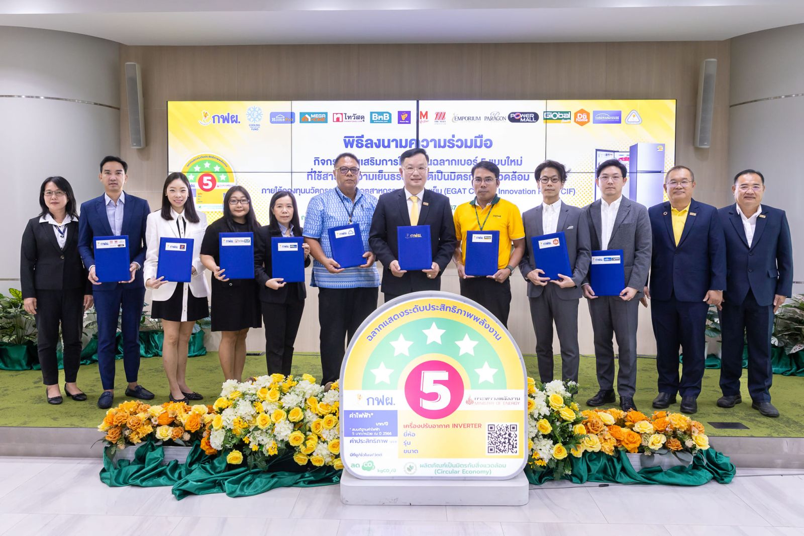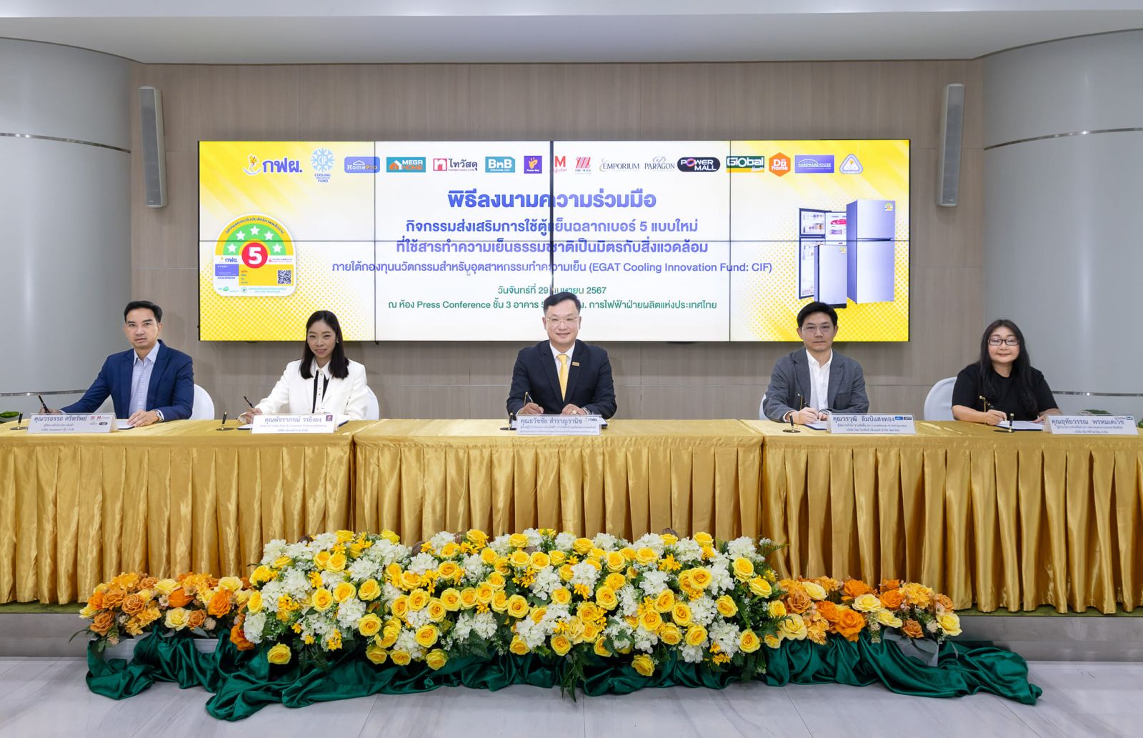 นายธวัชชัย สำราญวานิช ผู้ช่วยผู้ว่าการแผนงานโรงไฟฟ้า การไฟฟ้าฝ่ายผลิตแห่งประเทศไทย (กฟผ.) ประธานกรรมการบริหารกองทุนนวัตกรรมสำหรับอุตสาหกรรมทำความเย็น เปิดเผยว่า ปีนี้ กฟผ. ครบรอบ 55 ปี กฟผ. ร่วมกับผู้ประกอบการฉลากเบอร์ 5 และห้างสรรพสินค้าชั้นนำ จัดกิจกรรม “ร่วมรักษ์โลก ร่วมรักษ์พลังงาน ร่วมใช้ตู้เย็นฉลากเบอร์ 5 แบบใหม่” เปลี่ยนจากเบอร์ 5 แบบเก่าประสิทธิภาพสูงสุดที่ 3 ดาว เป็น 5 ดาว มอบสิทธิ์ส่วนลดแก่ประชาชน จำนวน 5,555 สิทธิ์ มูลค่ารวมเกือบ10 ล้านบาท เพื่อส่งเสริมให้ประชาชนเลือกใช้ตู้เย็นที่มีประสิทธิภาพสูง ช่วยประหยัดไฟฟ้า และใช้สารทำความเย็นธรรมชาติ หรือ สาร Isobutane (R600a) ไม่มีสี ไม่มีกลิ่น ไม่เป็นพิษ เป็นมิตรต่อสิ่งแวดล้อม