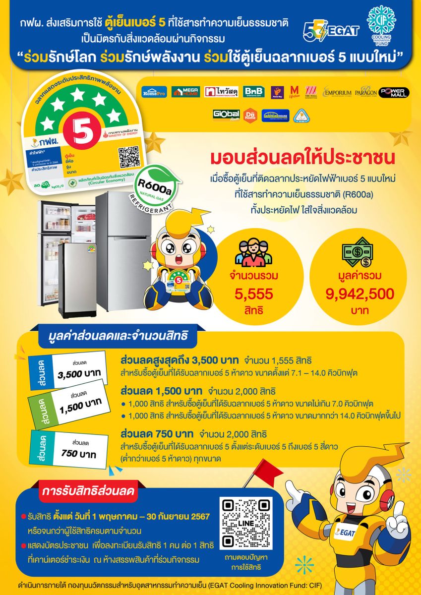 สำหรับสิทธิ์ส่วนลดดังกล่าว ประกอบด้วย 1) ส่วนลดสูงสุด 3,500 บาท จำนวน 1,555 สิทธิ์ สำหรับซื้อตู้เย็นที่ได้รับฉลากเบอร์ 5 ห้าดาว ขนาด 7.1 – 14.0 คิวบิกฟุต 2) ส่วนลด 1,500 บาท จำนวน 2,000 สิทธิ์ สำหรับซื้อตู้เย็นที่ได้รับฉลากเบอร์ 5 ห้าดาว ขนาดไม่เกิน 7 คิวบิกฟุต และมากกว่า 14 คิวบิกฟุตขึ้นไป ขนาดละ 1,000 สิทธิ์ และ 3) ส่วนลด 750 บาท จำนวน 2,000 สิทธิ์ สำหรับซื้อตู้เย็นที่ได้รับฉลากเบอร์ 5 ถึงฉลากเบอร์ 5 สี่ดาว โดยเปิดให้รับสิทธิ์ตั้งแต่วันที่ 1 พฤษภาคม – 30 กันยายน 2567 หรือจนกว่าผู้ใช้สิทธิ์จะครบตามจำนวน เพียงแสดงบัตรประชาชนเพื่อลงทะเบียนรับสิทธิ์ 1 คน ต่อ 1 สิทธิ์ ที่เคาน์เตอร์ชำระเงินของห้างสรรพสินค้าที่ร่วมกิจกรรมทั้ง 12 ราย ได้แก่ โฮมโปร เมกาโฮม ไทวัสดุ บีเอ็นบีโฮม เพาเวอร์บาย เดอะมอลล์ เอ็มโพเรียม สยามพารากอน โกลบอลเฮ้าส์ ดูโฮม ฮาร์ดแวร์เฮาส์ และร้านสหกรณ์ กฟผ.