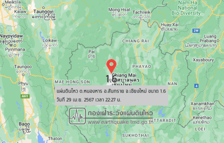 เวลา 22.27 น. วันที่ 29 เมษายน 2567 กองเฝ้าระวังแผ่นดินไหว กรมอุตุนิยมวิทยา แจ้งเหตุแผ่นดินไหว ขนาด 1.6 ความลึก 3 กม. ภายในพื้นที่ของ ต.หนองหาร อ.สันทราย จ.เชียงใหม่ (18.96°N,99.02°E) ยังไม่มีรายงานผลกระทบจากแรงสั่นสะเทือน