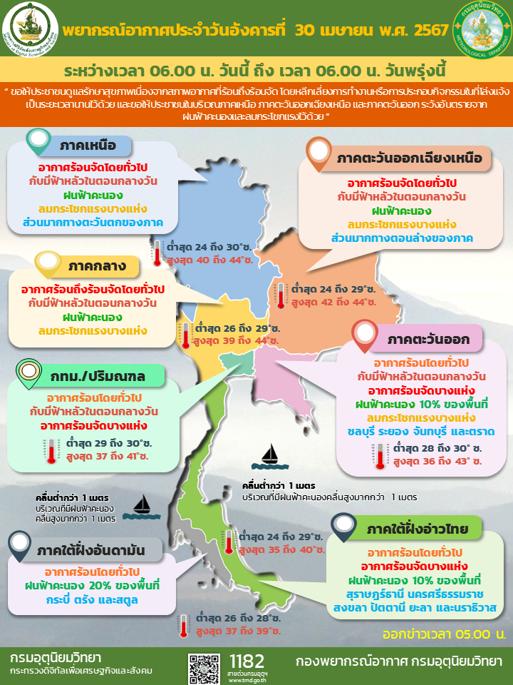 ลักษณะอากาศทั่วไป วันที่ 30 เมษายน 2567 พยากรณ์อากาศ 24 ชั่วโมงข้างหน้า ความกดอากาศต่ำเนื่องจากความร้อนปกคลุมประเทศไทยตอนบน ลักษณะเช่นนี้ทำให้ประเทศไทยมีอากาศร้อนถึงร้อนจัดโดยทั่วไปกับมีฟ้าหลัวในตอนกลางวัน ขอให้ประชาชนดูแลรักษาสุขภาพเนื่องจากสภาพอากาศที่ร้อนถึงร้อนจัด