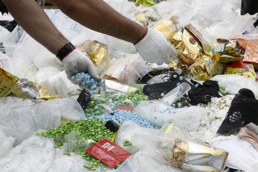 (แฟ้มภาพซินหัว : ยาเสพติดผิดกฎหมายที่จับยึดได้ในพิธีทำลายที่กรุงพนมเปญของกัมพูชา วันที่ 28 มิ.ย. 2023)