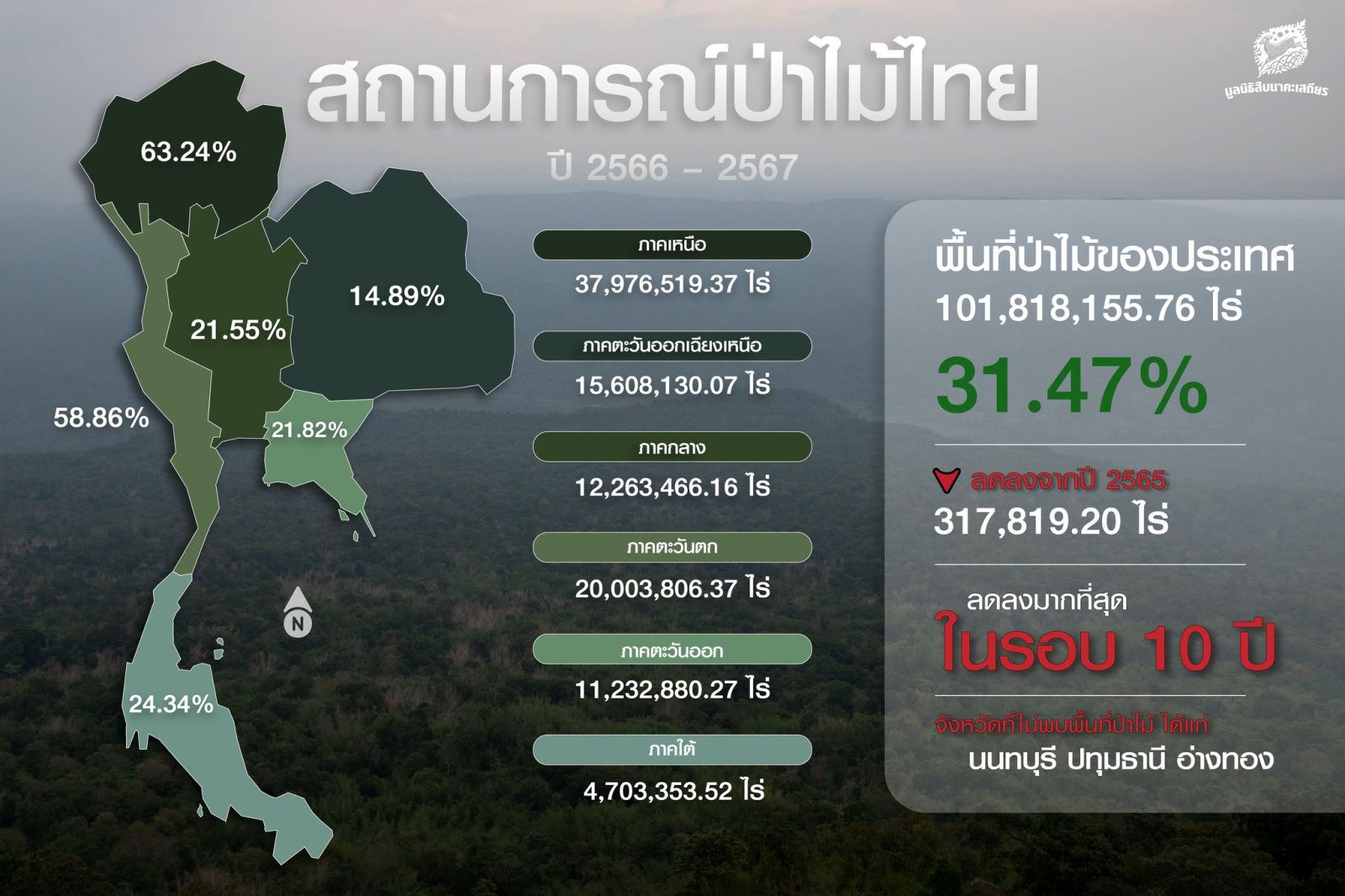 จากปี 2566 ถึงปี 2567 พบว่า ผืนป่าของไทยลดลงมากที่สุดในรอบ 10 ปี มีการสูญเสียพื้นที่ป่าไม้ถึง 317,819.20 ไร่ จากปี 2565 ที่มีพื้นที่ป่าไม้เหลือ 102,135,974.96 ไร่ หรือ 31.57% ของพื้นที่ประเทศ ปัจจุบันประเทศไทยมีพื้นที่ป่าไม้ “101,818,155.76 ไร่ หรือคิดเป็น 31.47%” ของพื้นที่ประเทศ ซึ่งมีพื้นที่ป่าไม้ที่ยังคงสภาพไม่มีการเปลี่ยนแปลงทั้งหมด 101,627,819.86 ไร่ และพื้นที่อื่นๆ ที่เปลี่ยนสภาพเป็นพื้นที่ป่าไม้อีก 190,335.90 ไร่