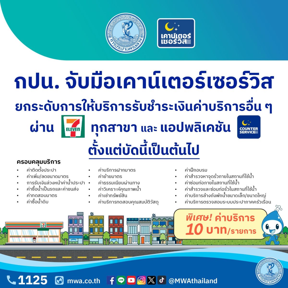 นอกจากนี้ ลูกค้ายังสามารถเลือกใช้บริการรับชำระเงินค่าน้ำประปา ค่าธรรมเนียมชำระเกินกำหนด (15 บาท) ค่าธรรมเนียมระงับน้ำชั่วคราว (107 บาท) ค่าธรรมเนียมระงับน้ำ (ร้อยละ 10 และร้อยละ 20) ได้เช่นเดิม ทั้งช่องทางจุดบริการเคาน์เตอร์เซอร์วิส ในร้าน 7-Eleven ทุกสาขา (อัตราค่าบริการ 10 บาท ต่อรายการ) แอปพลิเคชัน COUNTER SERVICE (อัตราค่าบริการ 5 บาท ต่อรายการ) รวมถึงแอปพลิเคชัน MWA onMobile และบนเว็บไซต์ (e-Service) ของ กปน. (อัตราค่าบริการพิเศษ 5 บาท ต่อรายการ จากเดิม 8 บาท ต่อรายการ)