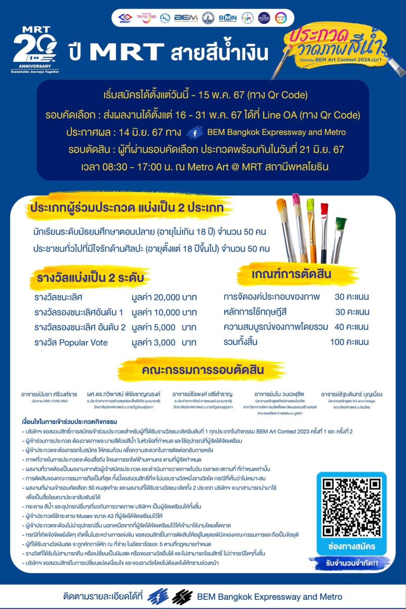 เนื่องในโอกาสครบรอบ 20 ปี รถไฟฟ้า MRT สายเฉลิมรัชมงคล (สายสีน้ำเงิน) บริษัท ทางด่วนและรถไฟฟ้ากรุงเทพ จำกัด (มหาชน) หรือ BEM ผู้ให้บริการทางพิเศษและรถไฟฟ้าสายสีน้ำเงินและ สายสีม่วง ร่วมกับ บริษัท แบงคอก เมโทร เน็ทเวิร์คส์ จำกัด หรือ BMN ผู้ให้บริการสื่อโฆษณาและพื้นที่จัดกิจกรรมในระบบรถไฟฟ้า MRT และทางด่วน และ เครือข่ายสมาคมสีน้ำโลก IWS ประเทศไทย (International Watercolor Society) เปิดโอกาสให้น้อง ๆ เยาวชน นักเรียน นิสิต นักศึกษา และประชาชนทั่วไปได้แสดงความสามารถด้านศิลปะ ผ่านการประกวดวาดภาพสีน้ำ ในกิจกรรม “BEM Art Contest ครั้งที่ 1 ประจำปี 2567” ภายใต้ Concept “20 ปี Anniversary MRT สายสีน้ำเงิน” ประเภทนักเรียนระดับมัธยมศึกษาตอนปลาย (ม.4-6) และประเภทประชาชนทั่วไปที่มีใจรักด้านศิลปะ (อายุตั้งแต่ 18 ปีขึ้นไป) ชิงรางวัลมูลค่ารวมกว่า 100,000 บาท พร้อมใบประกาศนียบัตร โดยจัดการประกวดพร้อมตัดสินและมอบรางวัลในวันที่ 21 มิถุนายน 2567 ณ ห้อง Art Learning Centre รถไฟฟ้า MRT สถานีพหลโยธิน