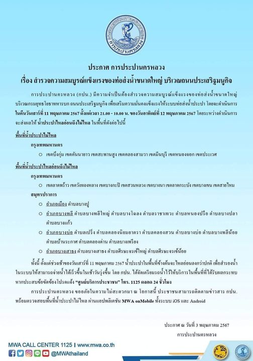 ทั้งนี้ ตั้งแต่ช่วงเช้าของวันเสาร์ที่ 11 พฤษภาคม 2567 น้ำประปาในพื้นที่ข้างต้นจะไหลอ่อนลงกว่าปกติ เพื่อสำรองน้ำในระบบให้สามารถจ่ายน้ำได้เร็วขึ้นในเช้าวันรุ่งขึ้น โดย กปน. ได้จัดเตรียมรถน้ำไว้ให้บริการในพื้นที่ที่ได้รับผลกระทบ หากประสบข้อขัดข้องโปรดแจ้ง “ศูนย์บริการประชาชน” โทร. 1125 ตลอด 24 ชั่วโมง