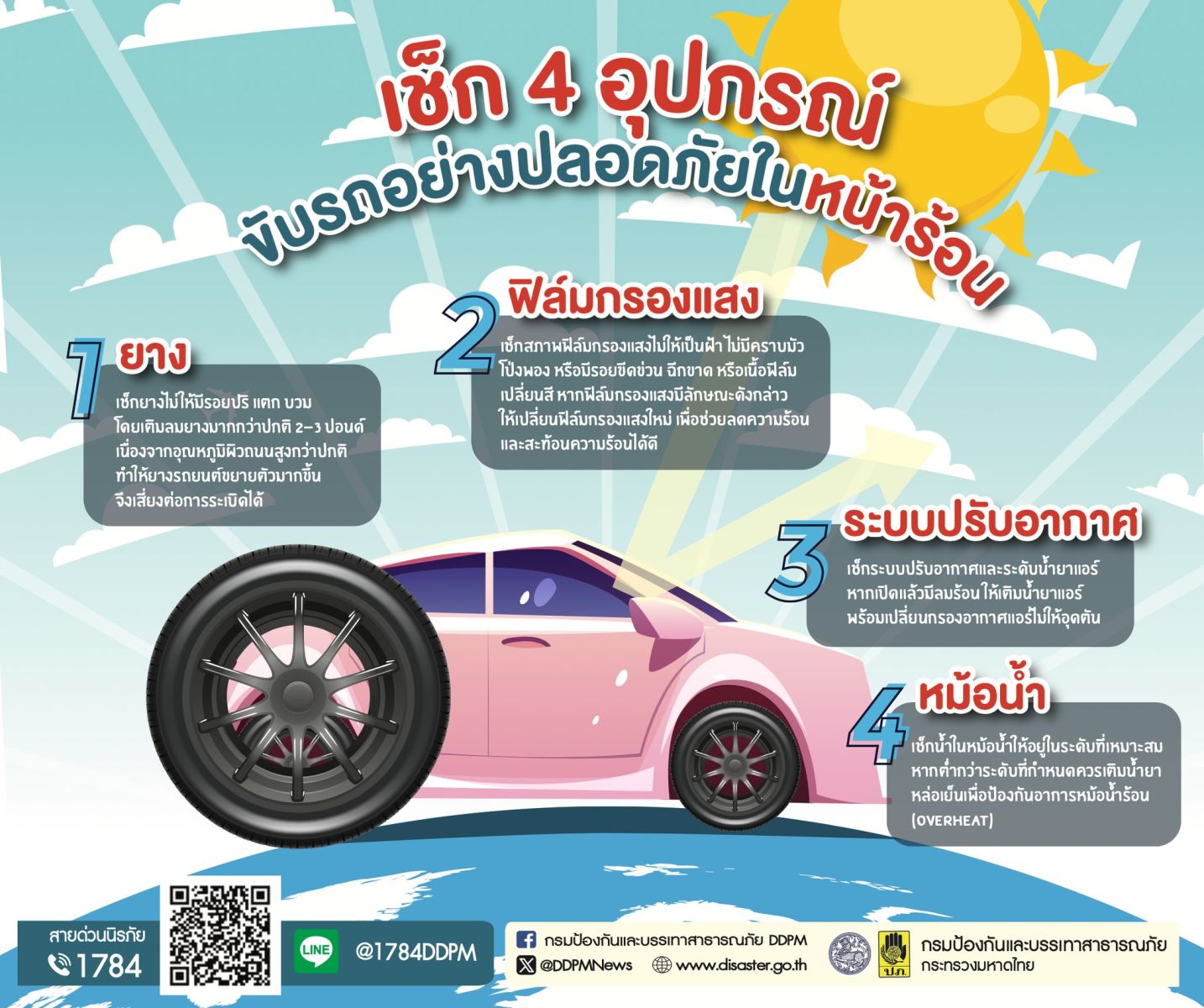 กรมป้องกันและบรรเทาสาธารณภัย (ปภ.) ขอแนะนำวิธีตรวจสอบและดูแลรถให้พร้อมใช้งานในช่วงฤดูร้อน ดังนี้ ตรวจสอบฟิล์มกรองแสง หากเป็นฝ้ามีคราบมัวโป่งพอง หรือเนื้อฟิล์มเปลี่ยนสี ให้เปลี่ยนฟิล์มกรองแสงใหม่ โดยเลือกติดฟิล์มกรองแสงที่ได้มาตรฐาน ไม่มีสีเข้มหรือทึบแสงมากเกินไป ซึ่งลดความร้อนและสะท้อนแสงได้ เพื่อช่วยลดอาการสายตาอ่อนล้าและป้องกันการเพลียแดดที่ทำให้ง่วงหลับในขณะขับรถ พร้อมตรวจรอยปริแตกบริเวณยางรถยนต์ รวมถึงเติมลมยางให้มากกว่าปกติ 2 -3 ปอนด์ จะช่วยลดความเสี่ยงต่อการเกิดอุบัติเหตุทางถนนจากยางรถระเบิด อีกทั้งตรวจสอบระบบหล่อเย็น โดยเช็กน้ำในหม้อน้ำไม่ให้ต่ำกว่าระดับที่กำหนด หม้อน้ำไม่มีรอยรั่วตามข้อต่อหรือท่อส่งน้ำ พัดลมหม้อน้ำไม่มีรอยแตกหักหรือเสื่อมสภาพ เพราะจะส่งผลต่อระบบระบายความร้อน ทำให้เครื่องยนต์ร้อนจัดและเป็นสาเหตุของการเกิดอุบัติเหตุได้ หมั่นสังเกตเข็มวัดระดับความร้อนบนหน้าปัดรถยนต์ หากระดับน้ำในหม้อน้ำพร่อง จะส่งผลให้ค่าร้อนสูงถึงตัว H ตลอดจนหมั่นทำความสะอาดกระจกหน้าและหลังรถ เพื่อไม่ให้มีฝุ่นเกาะสะสมที่ทำให้ทัศนวิสัยในการขับขี่ลดลง นอกจากนี้ ไม่ขับรถติดต่อกันเป็นเวลานาน ควรจอดพักรถเพื่อให้เครื่องยนต์และยางคลายความร้อน รวมถึงผู้ขับขี่ปรับเปลี่ยนอิริยาบถ จะช่วยลดความอ่อนล้าที่ทำให้หลับใน ซึ่งเป็นอีกสาเหตุหนึ่งของการเกิดอุบัติเหตุทางถนน