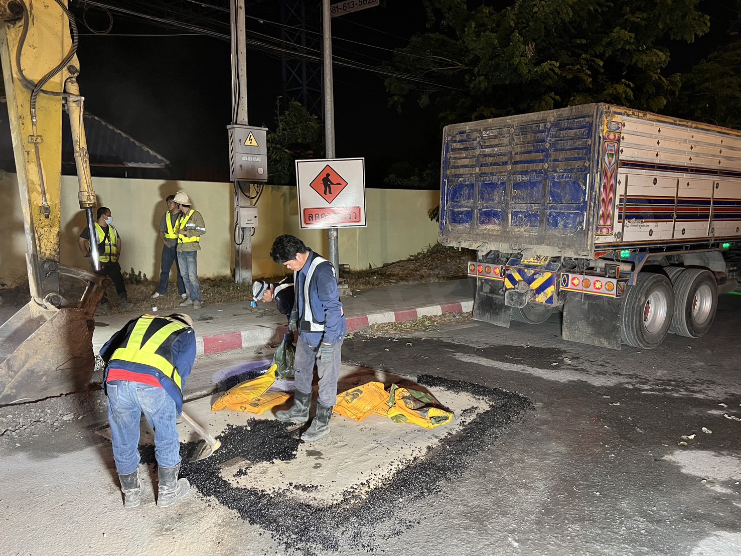 จากนั้นสำรวจขนาดหลุมใต้ผิวจราจร จึงได้ทำเครื่องหมายโดยการพ่นสีสเปร์ย เพื่อให้แบ็คโฮขนาดใหญ่ทำการงัดเปิดปากหลุมออก มีขนาดความกว้างประมาณ 1.5 เมตร คูณ 1.5 เมตร ส่วนขนาดด้านในหลุมเส้นผ่าศูนย์กลางกว้างประมาณ 3 เมตร ลึก 3 เมตร จากนั้นได้นำหินคลุกเทบดอัดภายในกลุมจำนวน 1 คันรถ จากนั้นได้ตัดผิวจราจร กว้าง 2.5 เมตร คูณ 3 เมตร หนา 25 ซม. เพื่อนำแผ่นซีเมนต์สำเร็จวางทับ ยาขอบด้วยยางมะตอยสำเร็จเป็นการซ่อมชั่วคราวเสร็จในเวลา 01.30 น.