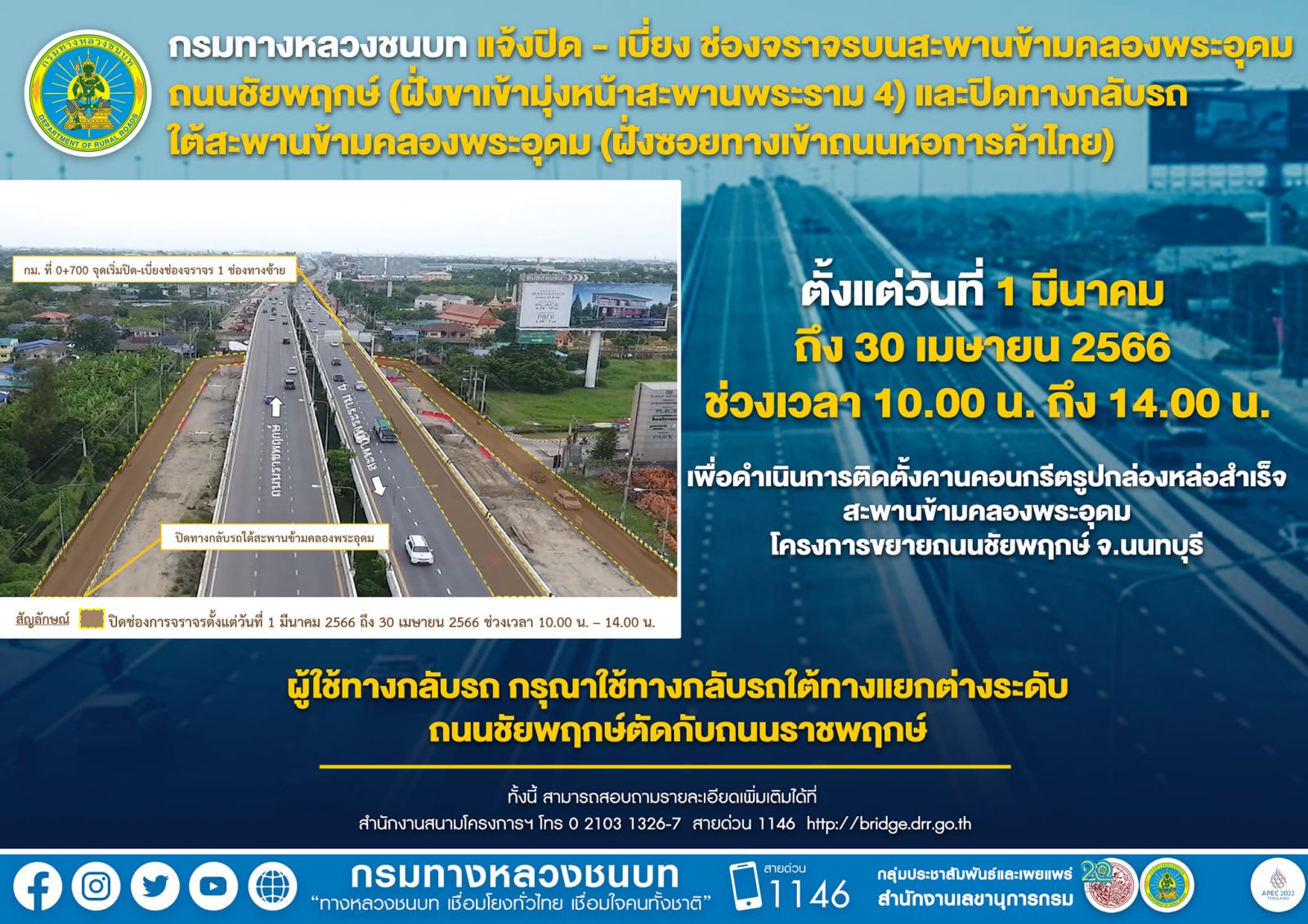 กรมทางหลวงชนบท (ทช.) โดยสำนักก่อสร้างสะพาน จะทำการปิด – เบี่ยง ช่องจราจรบนสะพานข้ามคลองพระอุดม ถนนชัยพฤกษ์ (ฝั่งขาเข้ามุ่งหน้าสะพานพระราม 4) จำนวน 1 ช่องทางซ้าย และปิดทางกลับรถใต้สะพานข้ามคลองพระอุดม (ฝั่งซอยทางเข้าถนนหอการค้าไทย) เพื่อดำเนินการติดตั้งคานคอนกรีตรูปกล่องหล่อสำเร็จ สะพานข้ามคลองพระอุดม ซึ่งเป็นส่วนหนึ่งของโครงการขยายถนนชัยพฤกษ์ จังหวัดนนทบุรี ระยะทาง 6.892 กิโลเมตร ทั้งนี้ ทช.จะเริ่มดำเนินการปิด – เบี่ยง ตั้งแต่วันที่ 1 มีนาคม ถึง 30 เมษายน 2566 ช่วงเวลา 10.00 น. – 14.00 น. ประชาชนสามารถใช้ทางกลับรถบริเวณทางแยกต่างระดับถนนชัยพฤกษ์ตัดกับถนนราชพฤกษ์ทดแทนได้ รวมถึง ประชาชนที่มีบ้านเรือนอาศัยอยู่บริเวณดังกล่าวยังคงสามารถใช้ทางคู่ขนาน เข้า – ออก ได้