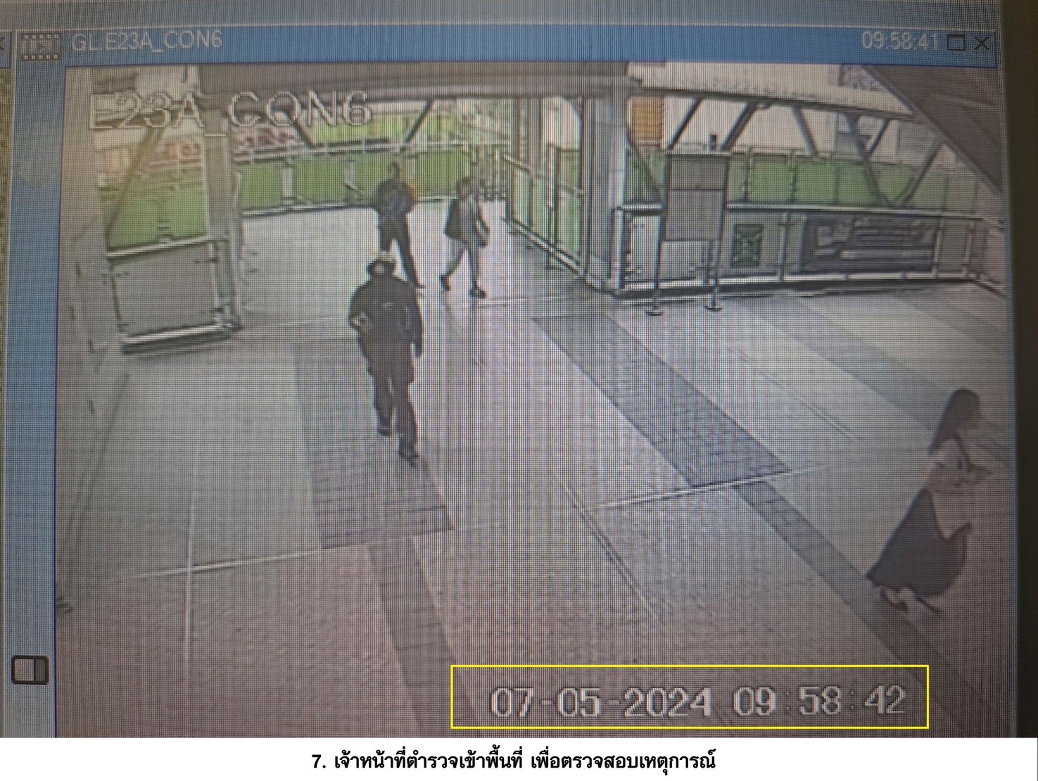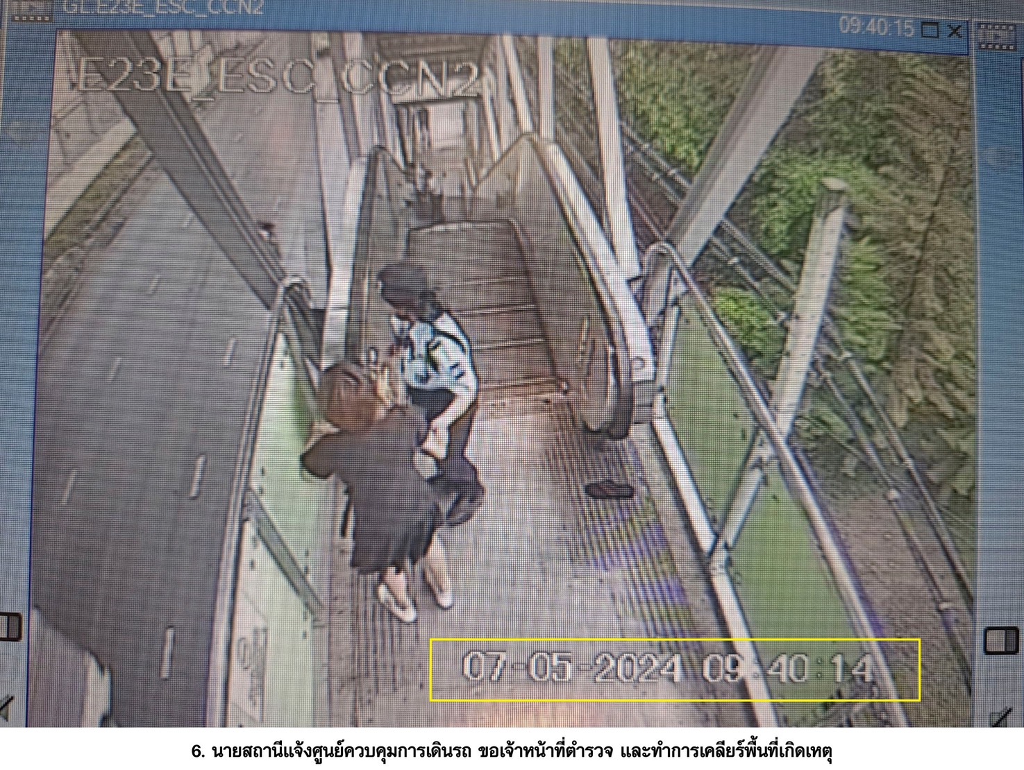 เมื่อได้รับแจ้งเหตุ เจ้าหน้าที่รักษาความปลอดภัย และนายสถานี ได้รีบไปยังพื้นที่เกิดเหตุทันที พบผู้โดยสารหญิง (ผู้เสียหาย) แต่ผู้ก่อเหตุได้วิ่งหนีลงบันไดเลื่อนไป ซึ่งเจ้าหน้าที่รักษาความปลอดภัยได้วิ่งตามลงไป แต่ไม่พบตัวผู้ก่อเหตุ จึงได้พาผู้โดยสารหญิง (ผู้เสียหาย) ไปพักยังห้องปฐมพยาบาลเพื่อดูแลสภาพจิตใจ และแจ้งสถานีตำรวจภูธรเมืองสมุทรปราการ เพื่อนำคลิปจากกล้องวงจรปิดให้ตรวจสอบ และอำนวยความสะดวกในเรื่องข้อมูลต่าง ๆ จนขยายผลไปสู่การจับกุมผู้ก่อเหตุในเวลาอันรวดเร็ว