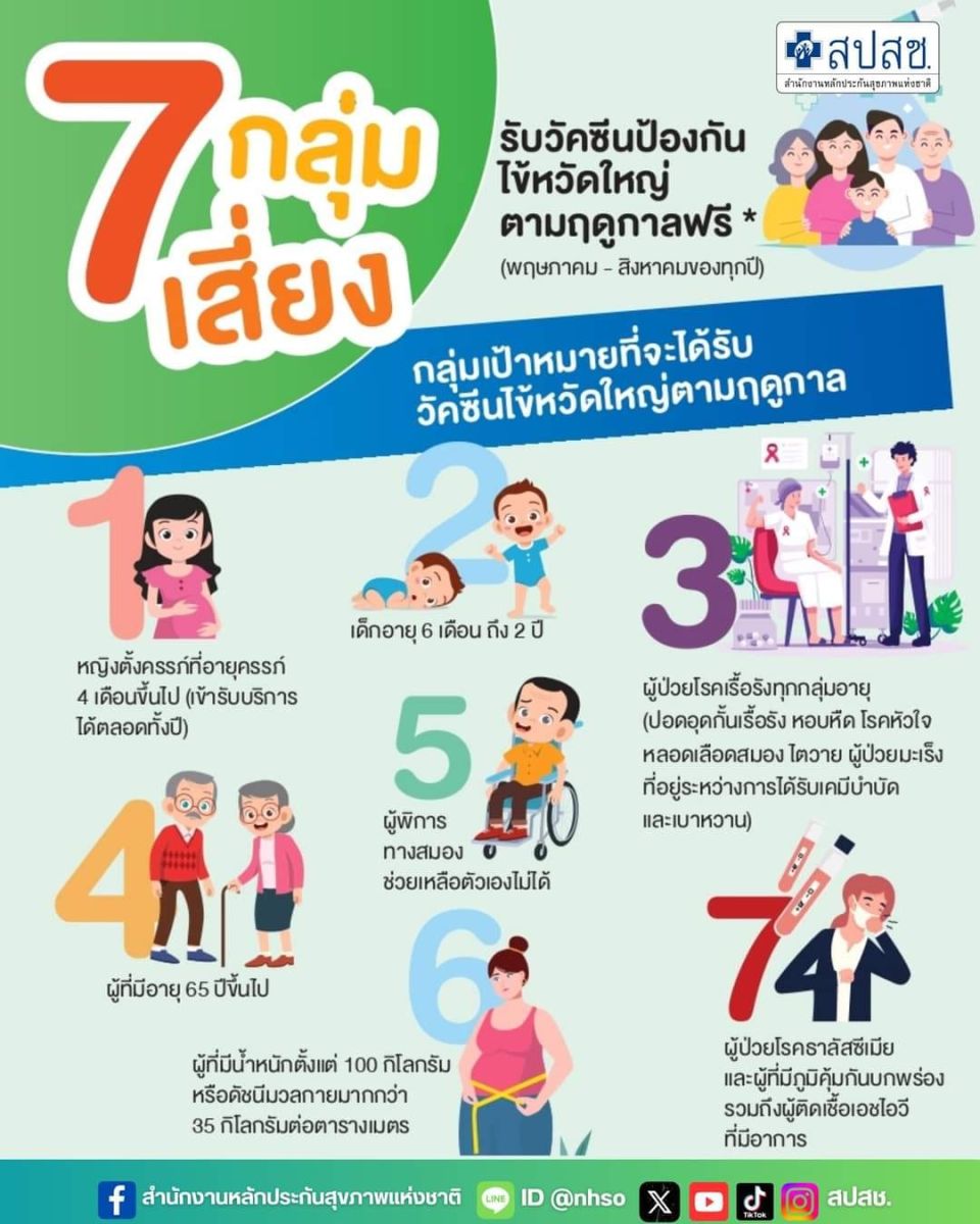 สำนักงานหลักประกันสุขภาพแห่งชาติและกระทรวงสาธารณสุข ได้เชิญชวนประชาชน 7 กลุ่มเสี่ยงจองคิวฉีดวัคซีนไข้หวัดใหญ่เพื่อสร้างเสริมภูมิคุ้มกัน ด้วยขั้นตอนง่าย ๆ ผ่าน “แอพพลิเคชั่นเป๋าตัง” ซึ่งฉีดฟรี ไม่มีค่าใช้จ่าย