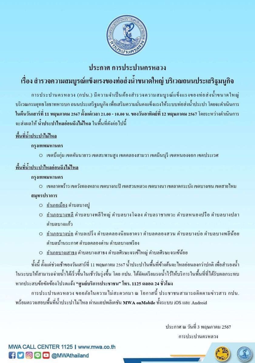 ทั้งนี้ ตั้งแต่ช่วงเช้าของวันเสาร์ที่ 11 พฤษภาคม 2567 น้ำประปาในพื้นที่ข้างต้นจะไหลอ่อนลงกว่าปกติ เพื่อสำรองน้ำในระบบให้สามารถจ่ายน้ำได้เร็วขึ้นในเช้าวันรุ่งขึ้น โดย กปน. ได้จัดเตรียมรถน้ำไว้ให้บริการในพื้นที่ที่ได้รับผลกระทบ หากประสบข้อขัดข้องโปรดแจ้ง “ศูนย์บริการประชาชน” โทร. 1125 ตลอด 24 ชั่วโมง