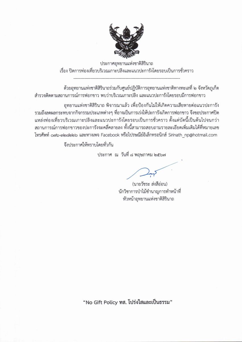 ประกาศอุทยานแห่งชาติสิรินาถ เรื่อง ปิดการท่องเที่ยวบริเวณเกาะปลิงและแนวปะการังโดยรอบเป็นการชั่วคราว