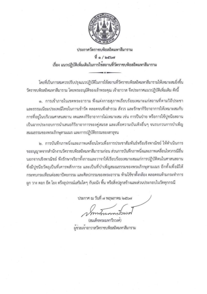 ประกาศวัดราชบพิธสถิตมหาสีมาราม ที่ ๑ / ๒๕๖๗