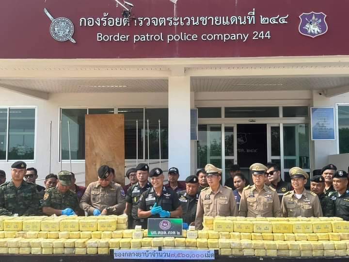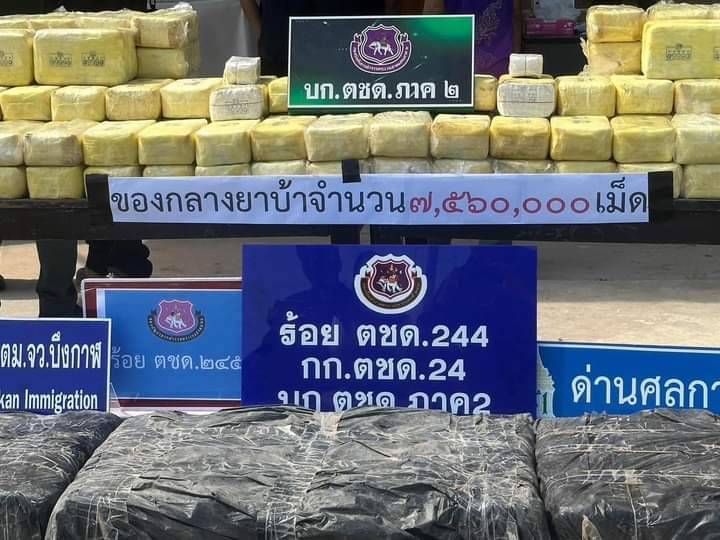 วันที่ 12 พ.ค.67 ร้อย ตชด. 244 อ.เมือง จ.บึงกาฬ พล.ต.ท.ยงเกียรติ มนปราณีต ผบช.ตชด. พร้อมด้วย ผบก.จว.บึงกาฬ , ปลัดจังหวัดบึงกาฬ, นายอำเภอเมืองบึงกาฬ, รอง ผบก.ตชด.ภาค 2, ผกก.ตชด.24, ผบ.ร้อย ตชด. 244 พร้อมชุดจับกุม และทหาร กกล.สุรศักดิ์ มนตรี ร่วมกันแถลงข่าว ตรวจยึดยาเสพติด (ยาบ้า) จำนวน 7,560,000 เม็ด จากขบวนการค้ายาเสพติดข้ามชาติลักลอบขนจากประเทศเพื่อนบ้านขึ้นริมฝั่งโขง ในพื้นที่ตำบลโคกก่อง อำเภอเมืองจังหวัดบึงกาฬ