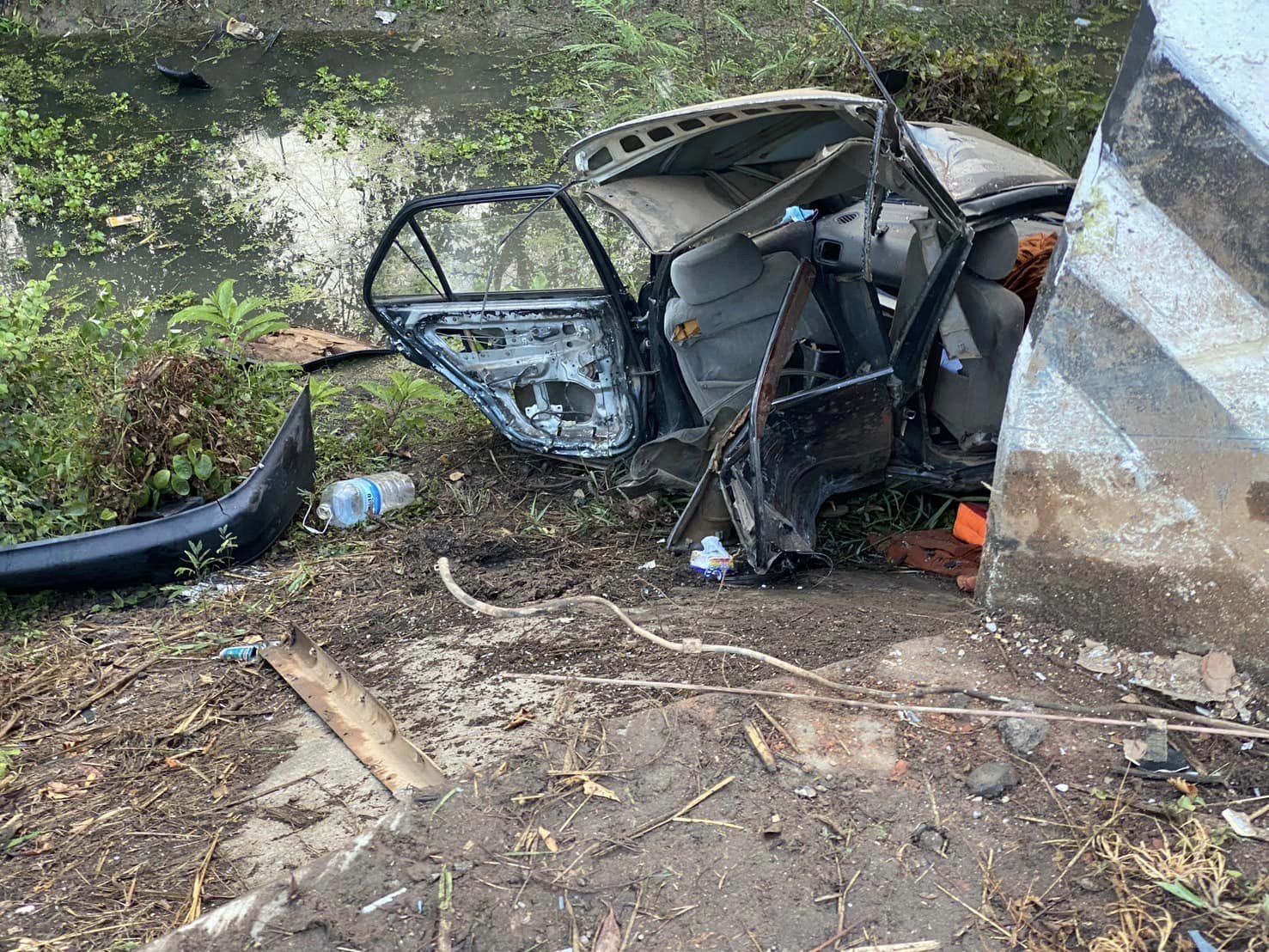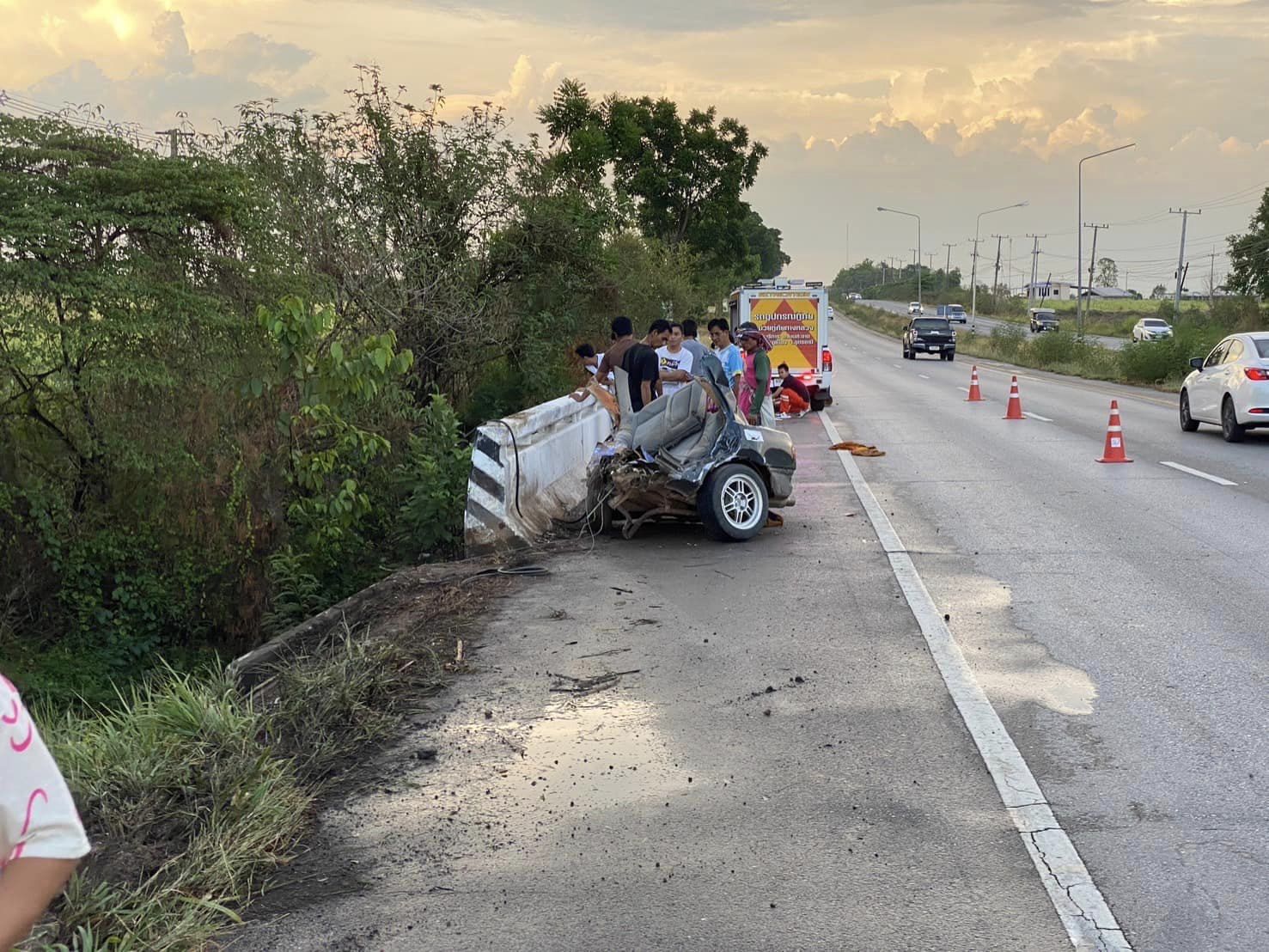 พบผู้บาดเจ็บ 1 รูปเป็นพระสงฆ์ ร่างกระเด็นออกจากตัวรถข้ามลำห้วยไปอีกฝั่ง มีอาการสาหัสไม่รู้สึกตัว เจ้าหน้าที่กู้ชีพ รพ.โนนสะอาด นำส่ง รพ.กุมภวาปี ทราบชื่อคือ พระสมพร อายุ 59 ปี