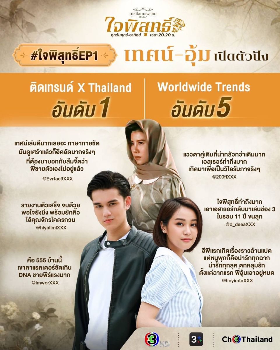 เปิดตัวปังจนอยากจะเครซี่ สำหรับละครชุด “ดวงใจเทวพรหม” เรื่อง “ใจพิสุทธิ์” ทางช่อง 3 โดยผู้จัด ฉัตรชัย เปล่งพานิช ที่เปิดมาด้วยความบู๊ แอคชั่น โรแมนติก พร้อมกลิ่นอายความคลาสสิก ยุค 90 แบบไม่ธรรมดา กับฉากเจอกันครั้งแรกกลางดงลูกกระสุนระหว่าง รณจักร (เทศน์ ไมรอน) และ หนูพุก (อุ้ม อิษยา) เรียกว่าจัดชุดใหญ่ไฟกระพริบสมชื่อ ค่าย เมตตาและมหานิยม จำกัด จนพาแฮชแท็ก #ใจพิสุทธิ์EP1 ติดเทรนด์ X ประเทศไทย อันดับ 1 กระฉ่อนไปถึงเทรนด์โลก อันดับ 5 กันเลยทีเดียว