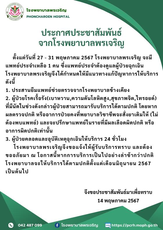 โรงพยาบาลพรเจริญจึงขอแจ้งให้ผู้รับบริการทราบ และต้องขออภัยมา ณ โอกาสนี้หากการบริการเป็นไปอย่างล่าช้ากว่าปกติ โรงพยาบาลจะให้บริการได้ตามปกติตั้งแต่เดือนมิถุนายน 2567 เป็นต้นไป