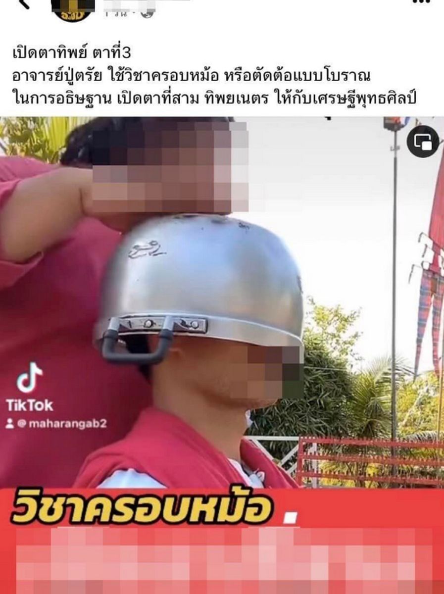 15 พ.ค.2567 เมื่อ"หม้อ"ได้ถูกดปลี่ยนสถานะจากอุปกรณ์หุงต้มในครัว ขยับมาเป็น เครื่องมือรักษาโรค ถือเป็นกระแสฮือฮา เมื่อโลกออนไลน์มีการแชร์ ภาพ และเรื่องราวของ อาจารย์ปู่ตรัย หรือ ฤาษีปู่ตรัย ศาสตร์ภูมิปัญญา ที่ทำการรักษาโรคด้วยวิชา "ครอบหม้อ-เปิดตาที่สาม" วิธีในการรักษาคือการใช้หม้ออลูมิเนียมไปครอบศีรษะ แล้วท่องคาถา อ้างว่าสามารถ เปิดตาเป็นตาที่สามได้ รักษาโรคได้สารพัดโรค ซึ่งที่ผ่านมาพบว่ามีประชาชนจากหลายจังหวัดแห่ไปรักษาเป็นจำนวนมาก