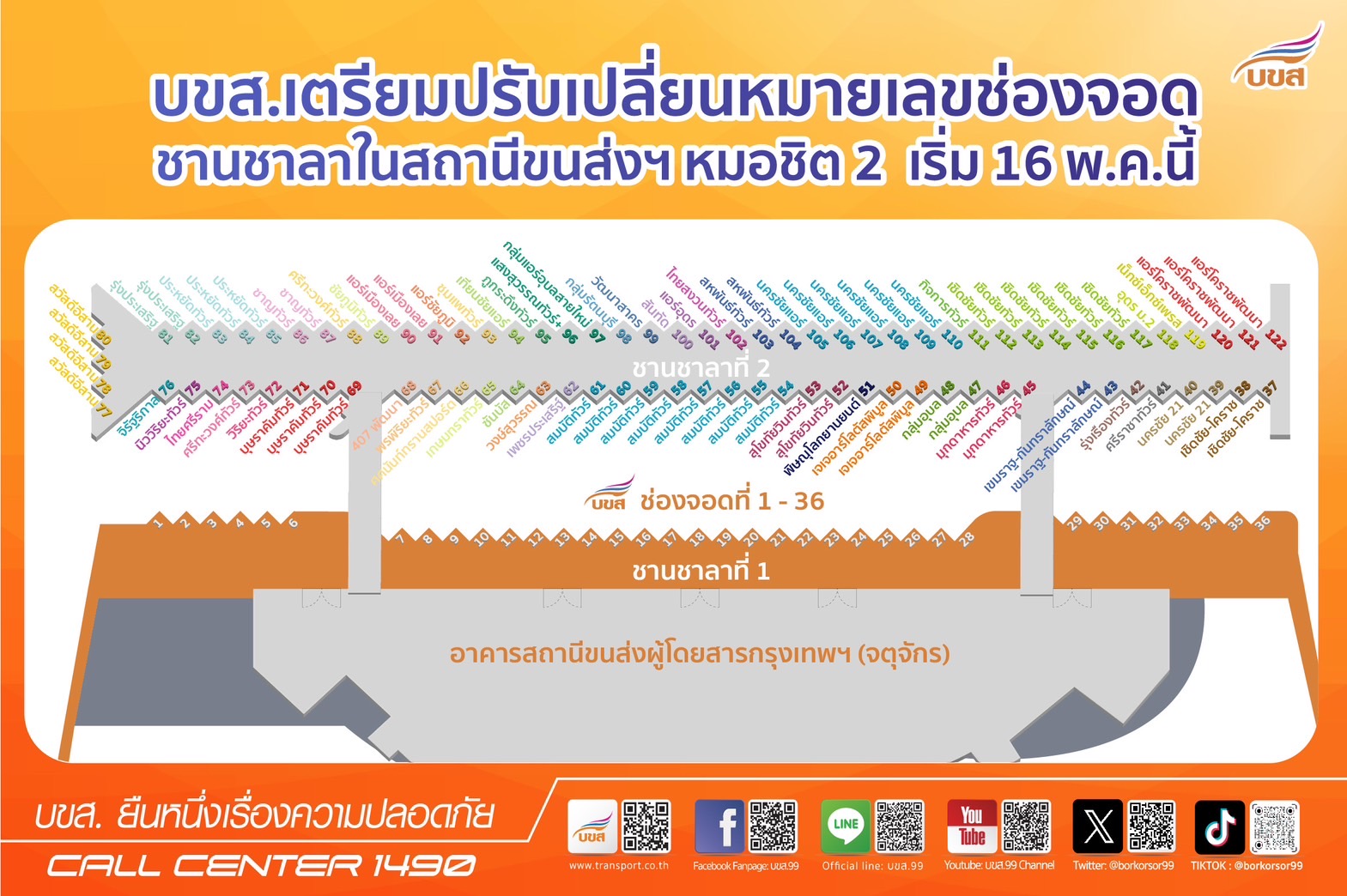 นายอรรถวิท รักจำรูญ กรรมการ รักษาการแทนกรรมการผู้จัดการใหญ่ บริษัท ขนส่ง จำกัด (บขส.) เปิดเผยว่า บขส. เตรียมปรับเปลี่ยนหมายเลขช่องจอดชานชาลา ในอาคารสถานีขนส่งผู้โดยสารกรุงเทพ (จตุจักร) ใหม่ ตั้งแต่วันที่ 16 พฤษภาคม 2567 เป็นต้นไป เพื่อเพิ่มความสะดวกในการเดินทาง และรองรับการพัฒนาพื้นที่สถานีขนส่งฯหมอชิต 2 ให้มีความทันสมัย ปลอดภัย และเป็นระเบียบเรียบร้อย ทั้งนี้ผู้ใช้บริการ สามารถสังเกตหมายเลขช่องจอดชานชาลา ภายในชานชาลา TERMINAL 1 และ 2 ดังนี้