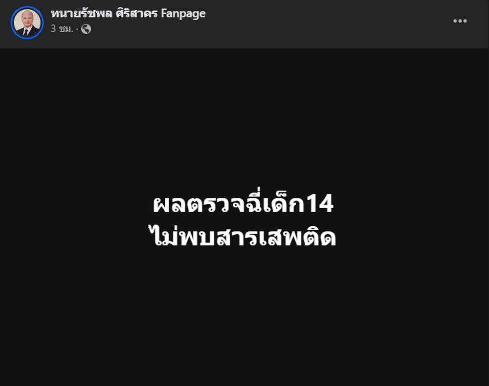 ล่าสุด ทนายรัชพล ได้โพสต์ข้อความผ่านเฟซบุ๊ก ทนายรัชพล ศิริสาคร ระบุว่า “ผลตรวจฉี่เด็ก14 ไม่พบสารเสพติด”
