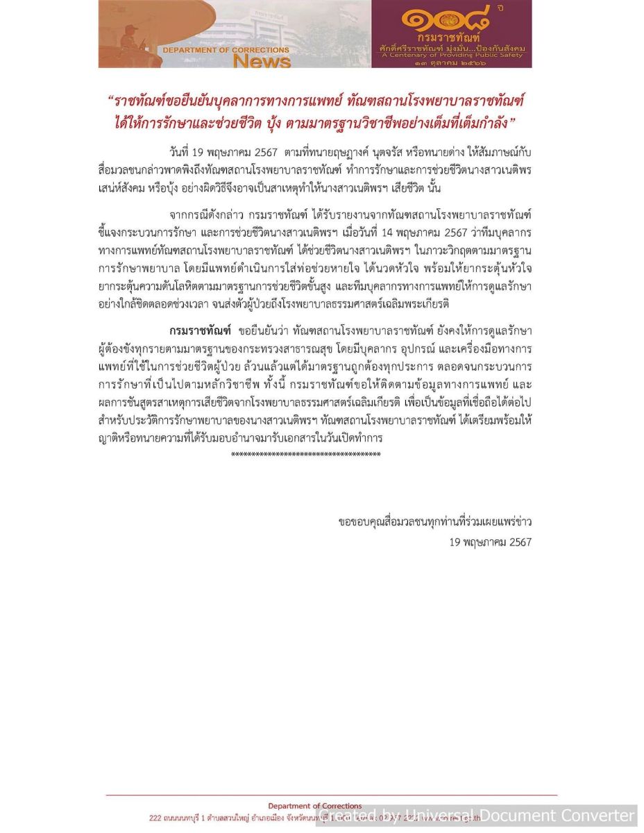 กรมราชทัณฑ์ ขอยืนยันว่า ทัณฑสถานโรงพยาบาลราชทัณฑ์ ยังคงให้การดูแลรักษาผู้ต้องขังทุกรายตามมาตรฐานของกระทรวงสาธารณสุข โดยมีบุคลากร อุปกรณ์ และเครื่องมือทางการแพทย์ที่ใช้ในการช่วยชีวิตผู้ป่วย ล้วนแล้วแต่ได้มาตรฐานถูกต้องทุกประการ ตลอดจนกระบวนการการรักษาที่เป็นไปตามหลักวิชาชีพ