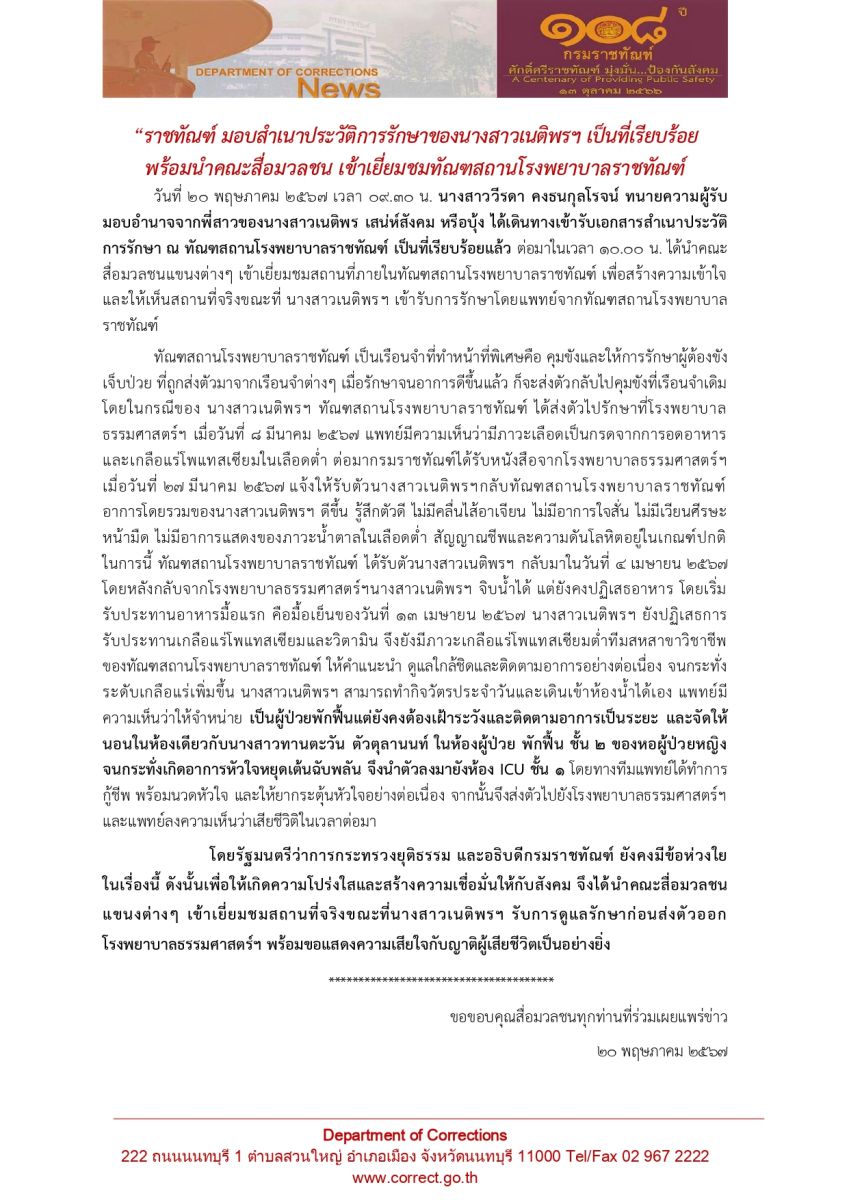 เมื่อเวลา 09.30 น. วันที่ 20 พฤษภาคม น.ส.วีรดา คงธนกุลโรจน์ ทนายความผู้รับมอบอำนาจจาก พี่สาวของ น.ส.เนติพร เสน่ห์สังคม หรือ บุ้ง ได้เดินทางเข้ารับเอกสารสำเนาประวัติการรักษา ณ ทัณฑสถานโรงพยาบาลราชทัณฑ์ เป็นที่เรียบร้อยแล้ว ต่อมาเวลา 10.00 น. ได้นำคณะสื่อมวลชนแขนงต่างๆ เข้าเยี่ยมชมสถานที่ภายในทัณฑสถานโรงพยาบาลราชทัณฑ์เพื่อสร้างความเข้าใจและให้เห็นสถานที่จริงขณะที่ น.ส.เนติพร เข้ารับการรักษาโดยแพทย์จากทัณฑสถานโรงพยาบาลราชทัณฑ์