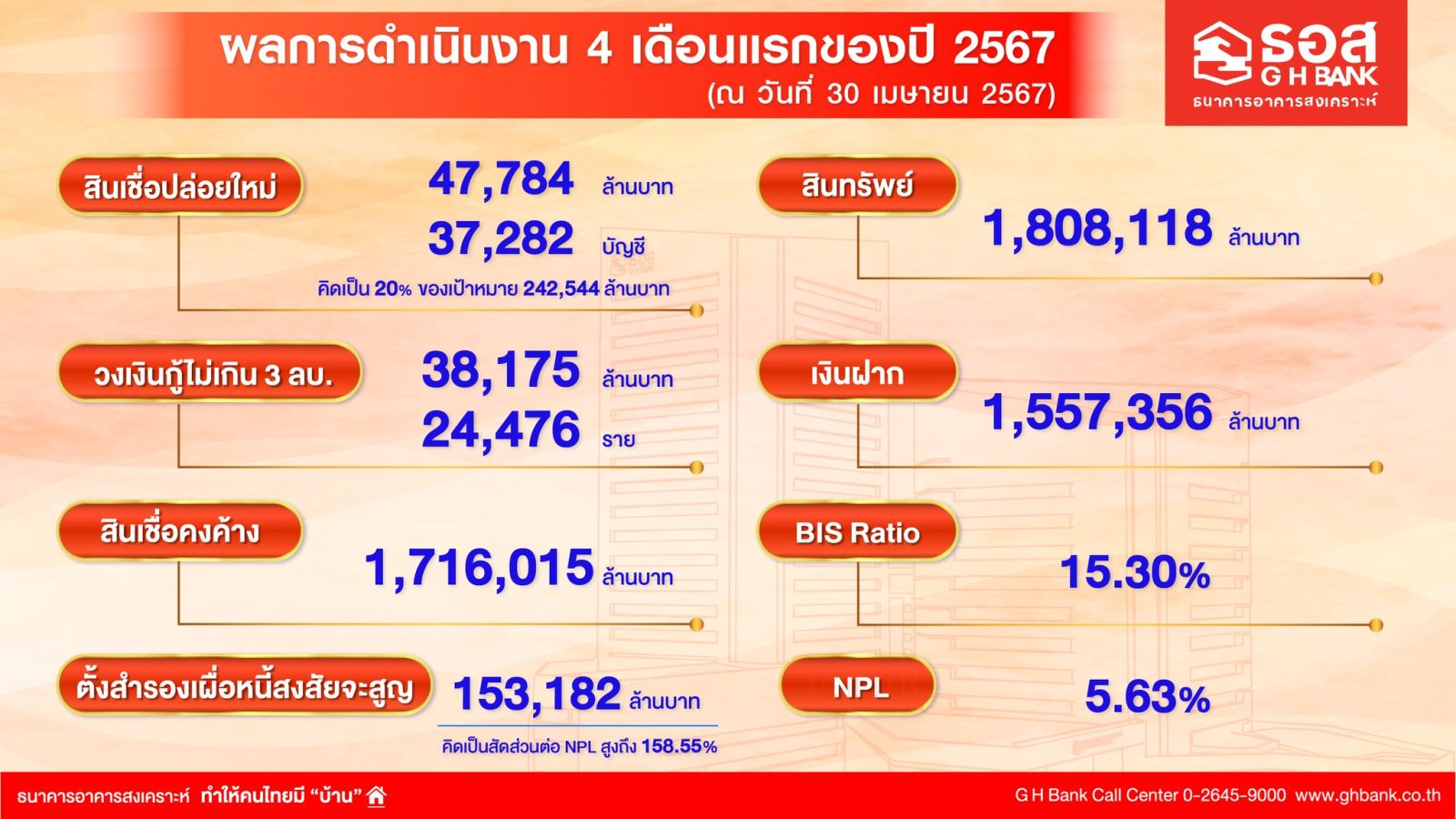 นายกมลภพ วีระพละ กรรมการผู้จัดการ ธนาคารอาคารสงเคราะห์ (ธอส.) เปิดเผยว่า ธอส. ในฐานะสถาบันการเงินเฉพาะกิจของรัฐที่มีพันธกิจ “ทำให้คนไทยมีบ้าน” พร้อมสนับสนุนนโยบายรัฐบาลและกระทรวงการคลัง ในการช่วยเหลือประชาชนให้มีที่อยู่อาศัยเป็นของตนเอง ลดความเหลื่อมล้ำทางสังคม และเป็นกลไกสำคัญในการขับเคลื่อนเศรษฐกิจผ่านภาคอสังหาริมทรัพย์ โดย ณ วันที่ 30เมษายน 2567 ธอส. สามารถปล่อยสินเชื่อใหม่จำนวน 37,282 บัญชี คิดเป็นวงเงิน 47,784 ล้านบาท หรือ 20% ของเป้าหมายในปี 2567 ที่ตั้งไว้ 242,544 ล้านบาท โดยในจำนวนนี้เป็นสินเชื่อปล่อยใหม่ให้กับลูกค้าที่ต้องการวงเงินกู้ไม่เกิน 3 ล้านบาท สำหรับกลุ่มผู้มีรายได้น้อยและปานกลางถึง 24,476 ราย โดยมีสินเชื่อคงค้างรวมทั้งสิ้น 1,716,015 ล้านบาท เพิ่มขึ้น 0.14% เมื่อเทียบ ณ สิ้นปี 2566 สินทรัพย์รวม 1,808,118 ล้านบาท เพิ่มขึ้น 1.26% เงินฝากรวม 1,557,356 ล้านบาท เพิ่มขึ้น 1.08% หนี้ที่ไม่ก่อให้เกิดรายได้ (NPL) 5.63% ของยอดสินเชื่อรวม