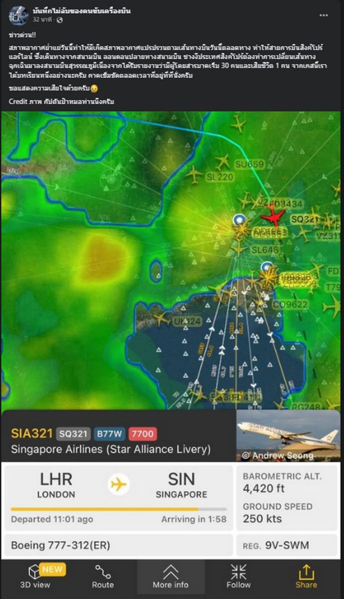 ข่าวด่วน!! สภาพอากาศย่ำแย่วันนี้ทำให้มีเกิดสภาพอากาศแปรปรวนตามเส้นทางบินวันนี้ตลอดทาง ทำให้สายการบินสิงคโปร์แอร์ไลน์ ซึ่งเดินทางจากสนามบิน ลอนดอนปลายทางสนามบิน ชางงีประเทศสิงคโปร์ต้องทำการเปลี่ยนเส้นทางฉุกเฉินมาลงสนามบินสุวรรณภูมิเนื่องจากได้รับรายงานว่ามีผู้โดยสารบาดเจ็บ 30 คนและเสียชีวิต 1 คน จากเคสนี้เราได้บทเรียนหนึ่งอย่างนะครับ คาดเข็มขัดตลอดเวลาที่อยู่ที่ที่นั่งครับ