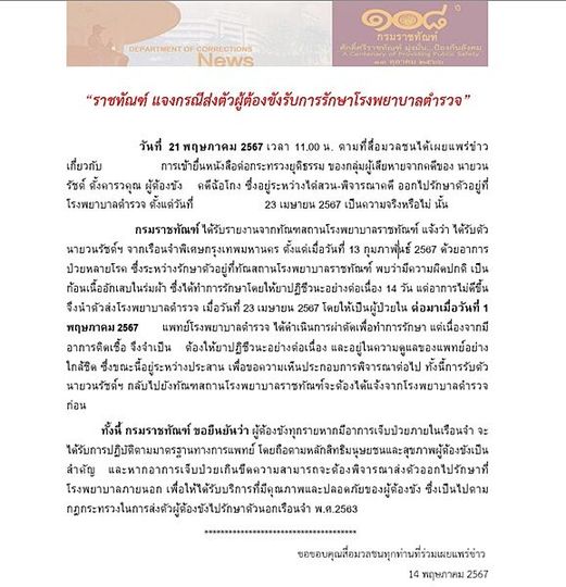 วันที่ 22 พ.ค.2567 กรมราชทัณฑ์ ได้เผยแพร่เอกสารข่าวชี้แจง ระบุว่า ตามที่สื่อมวลชนได้เผยแพร่ข่าวเกี่ยวกับการเข้ายื่นหนังสือต่อกระทรวงยุติธรรม ของกลุ่มผู้เสียหายจากคดีของ นายวนรัชต์ ตั้งคารวคุณ ผู้ต้องขัง คดีฉ้อโกง ซึ่งอยู่ระหว่างไต่สวน-พิจารณาคดี ออกไปรักษาตัวอยู่ที่โรงพยาบาลตำรวจ ตั้งแต่วันที่ 23 เม.ย.2567 เป็นความจริงหรือไม่ นั้น