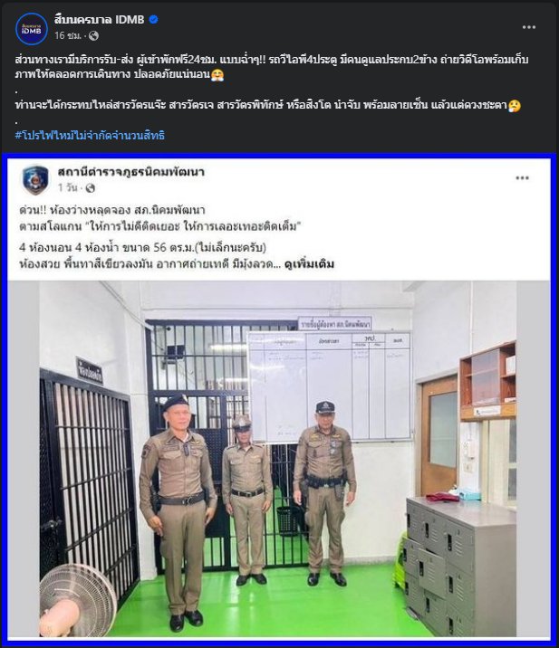 ล่าสุด เพจสืบนครบาล IDMB ก็ออกโปรไฟไหม้ ด้วยบริการรับ-ส่ง ผู้เข้าพักฟรี 24 ชั่วโมง โดยระบุว่า "ส่วนทางเรามีบริการรับ-ส่ง ผู้เข้าพักฟรี 24 ชม. แบบฉ่ำๆ!! รถวีไอพี 4 ประตู มีคนดูแลประกบ 2 ข้าง ถ่ายวิดีโอพร้อมเก็บภาพให้ตลอดการเดินทาง ปลอดภัยแน่นอน ท่านจะได้กระทบไหล่สารวัตรแจ๊ะ สารวัตรเจ สารวัตรพิทักษ์ หรือสิงโต นำจับ พร้อมลายเซ็น แล้วแต่ดวงชะตา โปรไฟไหม้ไม่จำกัดจำนวนสิทธิ"