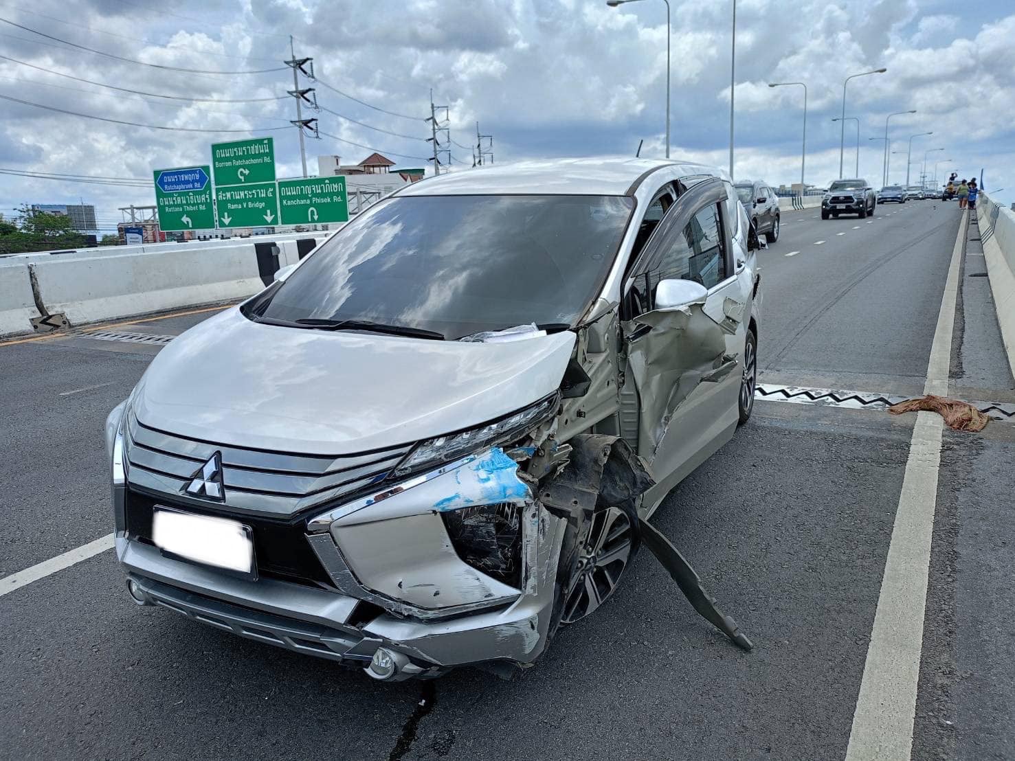 ที่เกิดเหตุเป็นด้านถนนนครอินทร์ ฝั่งขาออกจากสะพานพระราม 5 มุ่งหน้าถนนกาญจนาภิเษก บนสะพานข้ามวงเวียนพระราม 5 พบรถกระบะยี่ห้อ อีซูซุ สีดำ ทะเบียนกรุงเทพมหานคร สภาพท้ายรถและหน้ารถด้านขวามีร่องรอยถูกชนพังเสียหาย ห่างไปเล็กน้อยยังพบอีก 1 คันเป็นรถนั่งส่วนบุคคล ยี่ห้อมิตซูบิชิ สีบรอนซ์ ทะเบียนกรุงเทพมหานคร มีร่องรอยเสียหายที่ด้านท้ายและด้านหน้าฝั่งซ้ายพังเสียหายเช่นกันจอดอยู่