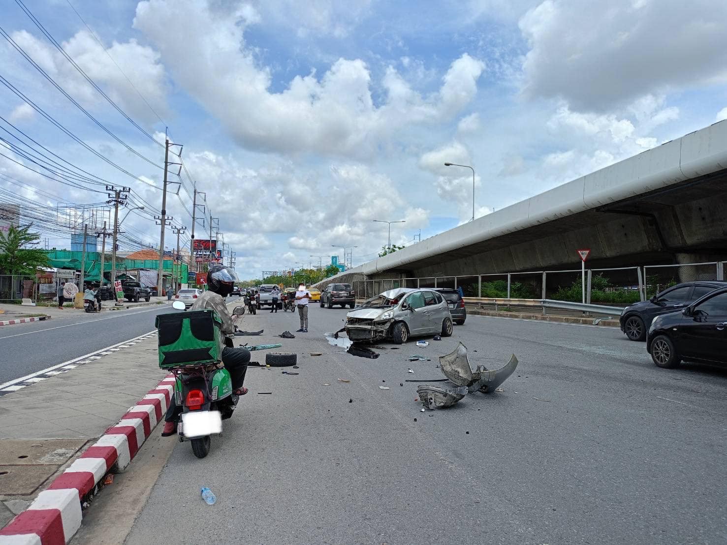น.ส.ฝน (นามสมมุติ) อายุ 38 ปี กล่าวว่า ตนเองนั่งอยู่ในรถกระบะอีซูซุ โดยมีแฟนเป็นคนขับก่อนเกิดเหตุขับมาในเลนซ้ายเพราะว่าลงสะพานจะเบี่ยงเข้าคู่ขนานก็จะถึงบ้านแล้ว จู่ๆก็มีความรู้สึกว่าถูกชนจากด้านท้าย หลังจากนั้นก็เห็นว่ารถเก๋ง ฮอนด้า แจ๊ส เสียหลักไปชนรถอีกคันที่อยู่เลนกลางก่อนที่ตัวรถเก๋ง ฮอนด้า แจ๊ส จะตีลังกาตกลงมาข้างล่างต่อหน้าต่อตา
