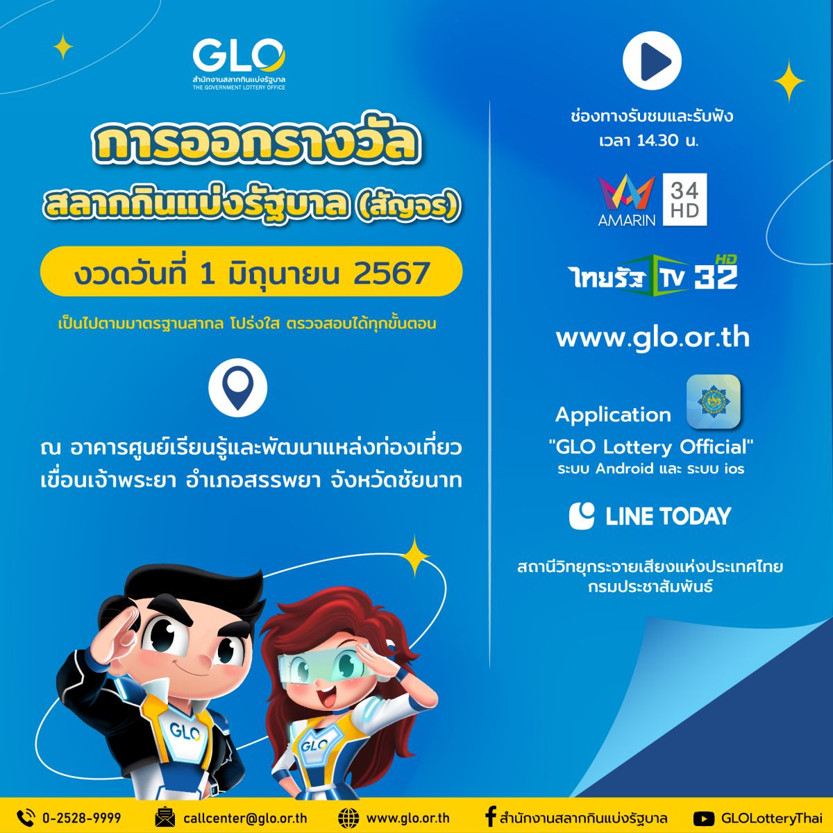 พันโท หนุน ศันสนาคม ผู้อำนวยการสำนักงานสลากกินแบ่งรัฐบาล เปิดเผยต่อผู้สื่อข่าวว่า ในการออกรางวัลงวดวันที่ 1 มิถุนายน 2567 นี้ สำนักงานสลากกินแบ่งรัฐบาลจะเดินทางไปออกรางวัลสลากสัญจร ณ อาคารศูนย์เรียนรู้และพัฒนาแหล่งท่องเที่ยว เขื่อนเจ้าพระยา อำเภอสรรพยา จังหวัดชัยนาท เพื่อเปิดโอกาสให้ประชาชนในต่างจังหวัดได้เห็นขั้นตอนและวิธีการตลอดจนอุปกรณ์ที่ใช้ในการออกรางวัลด้วยตนเอง จะได้ไม่หลงเชื่อข่าวลือเรื่องเลขเด็ดจากกลุ่มมิจฉาชีพที่ทำการหลอกลวงต้มตุ๋น ผ่านทางสังคมออนไลน์ และการส่งจดหมายแอบอ้างว่าสามารถให้ตัวเลขที่จะออกรางวัลได้ สำหรับการออกรางวัลครั้งนี้ ผู้ว่าราชการจังหวัดชัยนาท ให้เกียรติเป็นประธานกรรมการออกรางวัล รวมทั้งข้าราชการระดับสูง ผู้นำชุมชนและผู้แทนสื่อมวลชนในพื้นที่ร่วมเป็นคณะกรรมการออกรางวัล โดยจะเชิญข้าราชการหรือบุคลากรของจังหวัดร่วมทำหน้าที่หมุนวงล้อสลับกับพนักงานหมุนวงล้อของสำนักงานสลากกินแบ่งรัฐบาลด้วย สำหรับประชาชนที่สนใจสามารถเข้าชมการออกรางวัลได้ด้วยตนเองโดยไม่มีค่าใช้จ่าย พร้อมนำบัตรประจำตัวประชาชนหรือบัตรที่ทางราชการออกให้แสดงในวันดังกล่าวด้วย นอกจากนี้ยังสามารถรับชมการถ่ายทอดสดได้ผ่านช่องทางต่างๆ ดังนี้