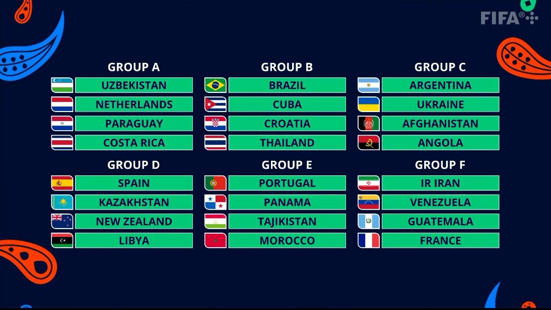 เมื่อวันที่ 26 พฤษภาคม 2567 เวลา 23.00 น. ตามเวลาประเทศไทย ณ จัตุรัสเรกิสถาน เมือง ซามาร์กานด์ สหพันธ์ฟุตบอลนานาชาติ หรือ FIFA จัดพิธีจับสลากแบ่งสายการแข่งขัน ฟุตซอลโลก 2024 (2024 FIFA Futsal World Cup) โดยผลการจับสลากมีดังนี้