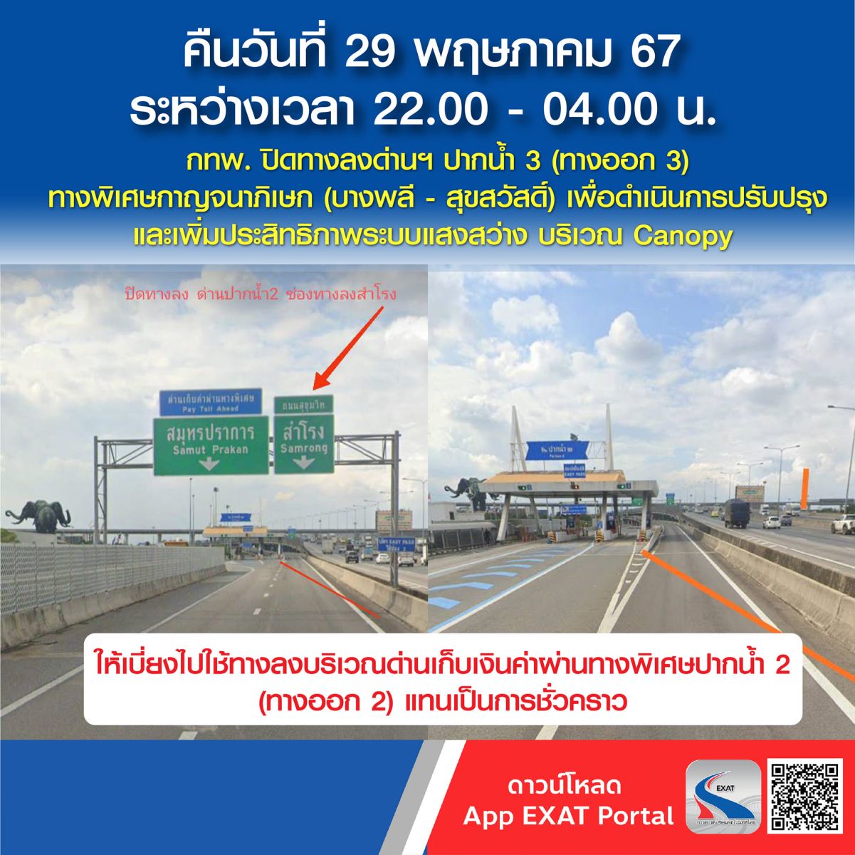 การทางพิเศษแห่งประเทศไทย (กทพ.) กระทรวงคมนาคม ได้ว่าจ้าง การไฟฟ้าส่วนภูมิภาค (กฟภ.) ดำเนินการปรับปรุงและเพิ่มประสิทธิภาพระบบแสงสว่าง บริเวณ Canopy ด่านเก็บค่าผ่านทางฯ ทางพิเศษบูรพาวิถี และทางพิเศษกาญจนาภิเษก (บางพลี - สุขสวัสดิ์) โดย กฟภ. มีกำหนดเข้าปรับปรุงโคมไฟ Canopy บริเวณด่านเก็บค่าผ่านทางพิเศษปากน้ำ 3 (ทางออก 3) ในวันที่ 29 พฤษภาคม 2567 ระหว่างเวลา 22.00 - 04.00 น. กทพ. จึงมีความจำเป็นต้องปิดทางลงบริเวณด่านฯ ดังกล่าว