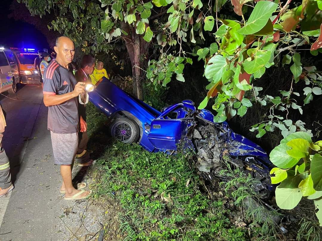 หนุ่มวัย 25 ปีขับรถกระบะ เสียหลักชนต้นไม้ข้างทาง เสียชีวิตในซากรถ จ.สุโขทัย