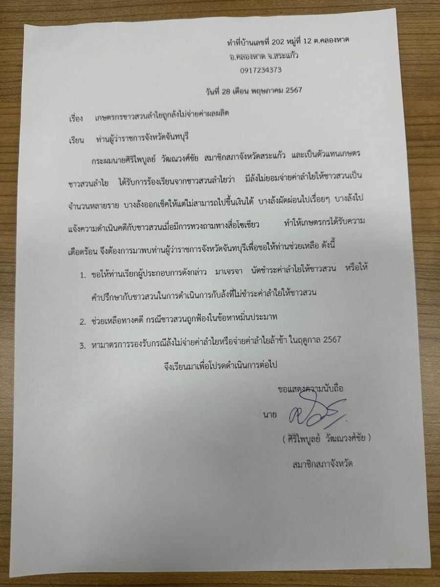 เมื่อเวลา 10.00น วันที่ 28 พฤษภาคม 2576 ผู้สื่อข่าวรายงานว่า นายศิริไพบูลย์ วัฒณวงศ์ชัย สมาชิกองค์การบริหารส่วนจังหวัดสระแก้ว นำเกษตรกร กว่า 50 คน จากจังหวัดจันทบุรีและสระแก้ว เดินทางมายังศาลากลางจังหวัดจันทบุรี เพื่อยื่นหนังสือร้องเรียนต่อนายมนสิทธิ์ ไพรศาลธนวัฒร์ ผู้ว่าราชการจังหวัดจันทบุรี หลังได้รับการร้องเรียนจากชาวสวนลำไยว่า มีล้งรับซื้อลำไยไม่ยอมจ่ายค่าลำไยให้ชาวสวน 20 รายมูลค่ากว่า 20 ล้านบาท