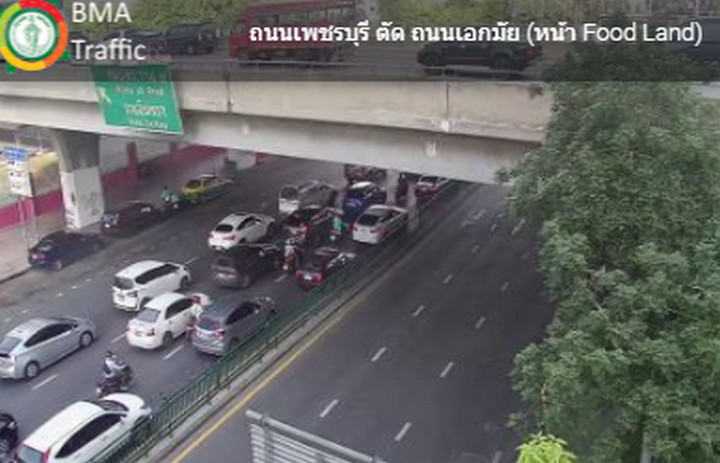 07.07 น. ถนนเพชรบุรี ขาเข้า แยกคลองตัน - แยกเอกมัยเหนือ เข้าแยกพร้อมพงษ์ - แยกอโศกเพชรบุรี รถมาก ท้ายแถวสะสมต่อเนื่องถนนพัฒนาการ ปากซอยพัฒนาการ 50