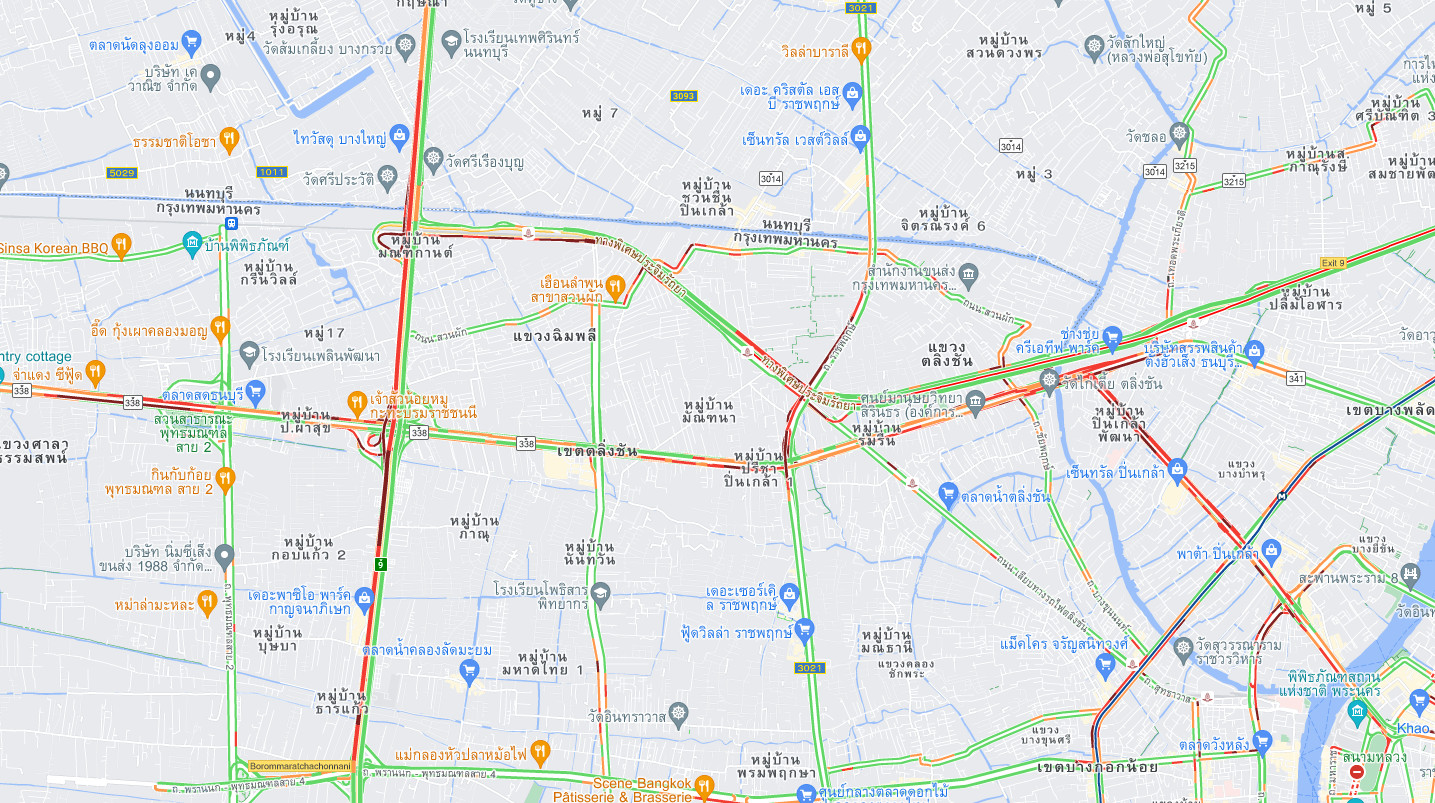 17.47 น. การจราจร ถ.ราชพฤกษ์ ขาออก จากบรมฯ ไปข้ามคลองมหาสวัสดิ์ รถหนาแน่น เคลื่อนตัวช้า ทำให้ ถ.บรมราชชนนี ขาออก ติดกระทบยาวไปถึงแยกบรมราชชนนี