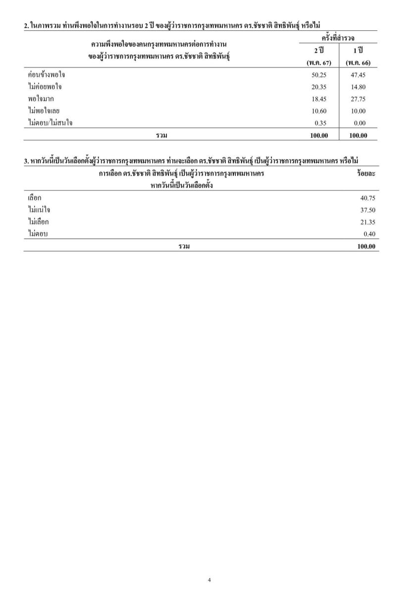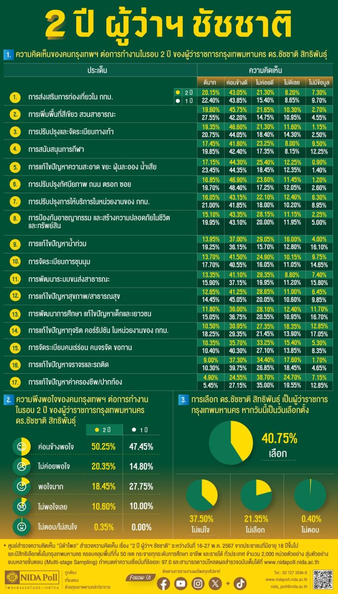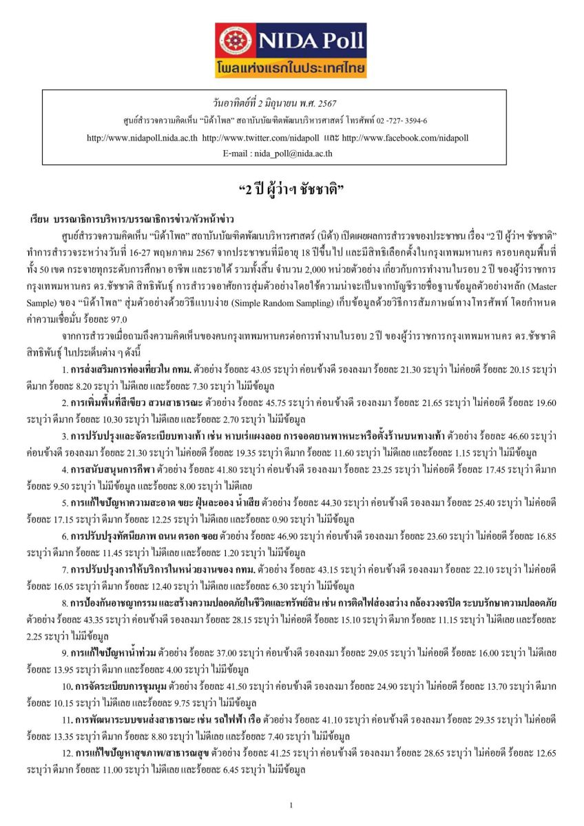 วันที่ 2 มิถุนายน 2567 ศูนย์สำรวจความคิดเห็น “นิด้าโพล” สถาบันบัณฑิตพัฒนบริหารศาสตร์ (นิด้า) เปิดเผยผลการสำรวจของประชาชน เรื่อง “2 ปี ผู้ว่าฯ ชัชชาติ” ทำการสำรวจระหว่างวันที่ 16 - 27 พฤษภาคม 2567 จากประชาชนที่มีอายุ 18 ปีขึ้นไป และมีสิทธิเลือกตั้งในกรุงเทพมหานคร ครอบคลุมพื้นที่ทั้ง 50 เขต