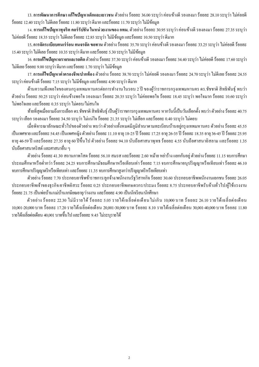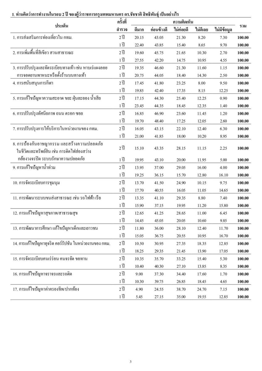 จากการสำรวจเมื่อถามถึงความคิดเห็นของคนกรุงเทพมหานครต่อการทำงานในรอบ 2 ปี ของผู้ว่าราชการกรุงเทพมหานคร ดร.ชัชชาติ สิทธิพันธุ์ ในประเด็นต่างๆ ดังนี้