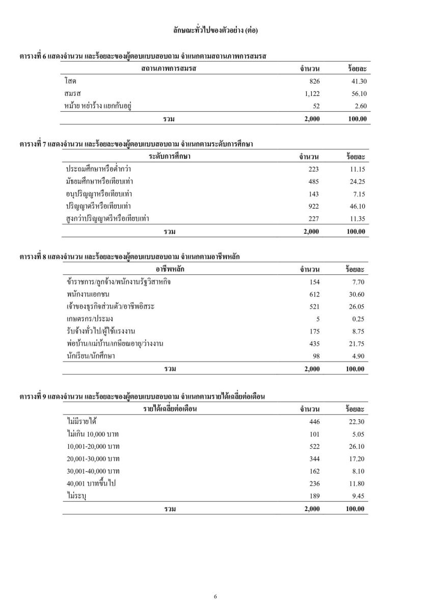5. การแก้ไขปัญหาความสะอาด ขยะ ฝุ่นละออง น้ำเสีย ตัวอย่าง ร้อยละ 44.30 ระบุว่า ค่อนข้างดี รองลงมา ร้อยละ 25.40 ระบุว่า ไม่ค่อยดี ร้อยละ 17.15 ระบุว่า ดีมาก ร้อยละ 12.25 ระบุว่า ไม่ดีเลย และร้อยละ 0.90 ระบุว่า ไม่มีข้อมูล