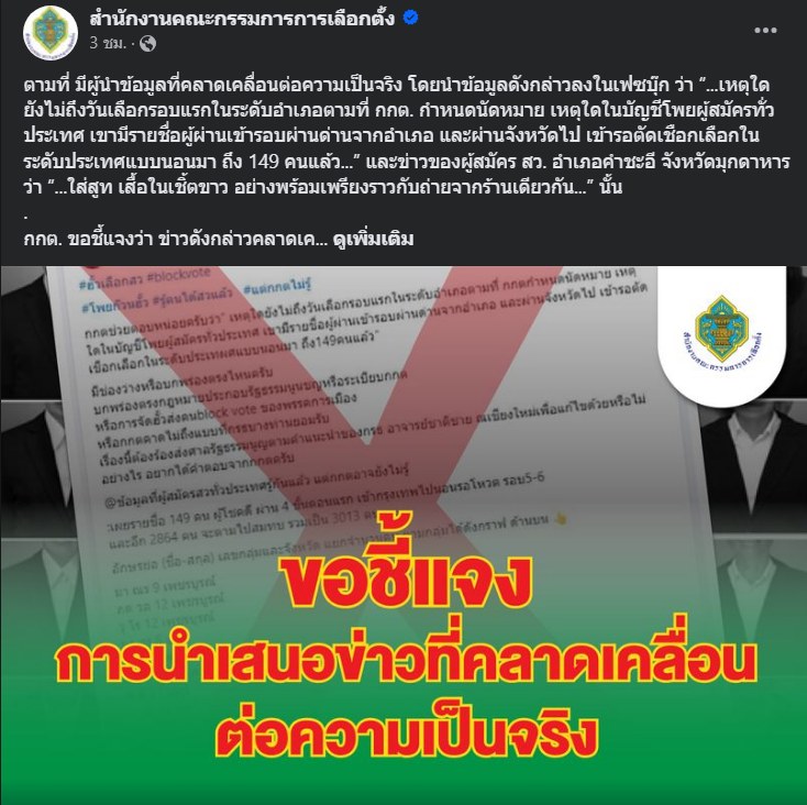 กกต. ขอชี้แจงว่า ข่าวดังกล่าวคลาดเคลื่อนต่อความเป็นจริง กล่าวคือ ขณะนี้ การเลือกผู้สมัคร สว. ในระดับอำเภอ,ระดับจังหวัด และระดับประเทศ ยังไม่ได้ดำเนินการลงคะแนนเลือกผู้สมัคร สว. การเสนอข่าว “...เข้ารอตัดเชือกเลือกในระดับประเทศแบบนอนมา ถึง 149 คนแล้ว...” นั้น จึงเป็นการคาดเดาของผู้เสนอข่าวโดยไม่มีมูลความจริง และปราศจากพยานหลักฐาน เพื่อยืนยันว่า ข้อเท็จจริงดังกล่าวเป็นความจริง