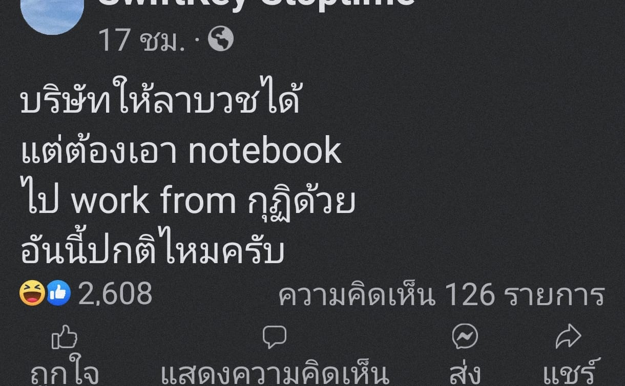5 มิถุนายน 2567 เมื่อการลางาน กลายเป็นประเด็นร้อนแรงในโลกออนไลน์ อีกครั้ง เมื่อมีหนุ่มรายหนึ่งแชร์ประสบการณ์ ขอลาไปบวชแต่บริษัทให้หอบงานไปทำด้วย ในกลุ่ม “JobThai Official Group” โดยระบุไว้ว่า “บริษัทให้ลาบวชได้ แต่ต้องเอา notebook ไป work from กุฏิด้วย อันนี้ปกติไหมครับ”