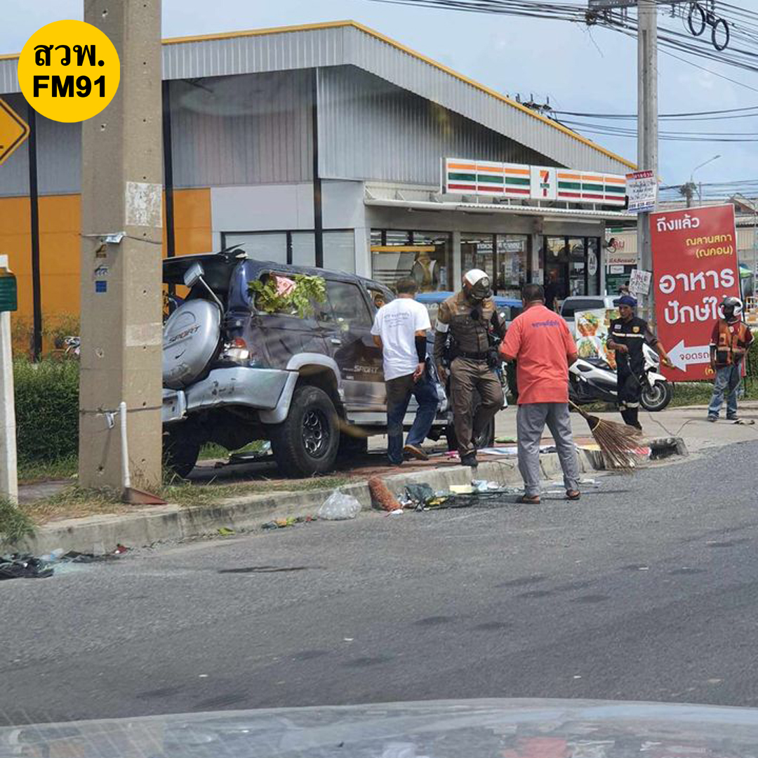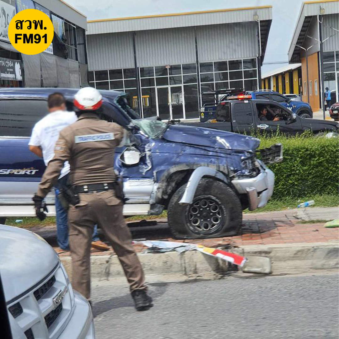 "กระทิงฟัดเสาไฟ" ริมถนนรัตนาธิเบศร์ สภาพรถพังยับ คนขับเจ็บเล็กน้อย จ.นนทบุรี
