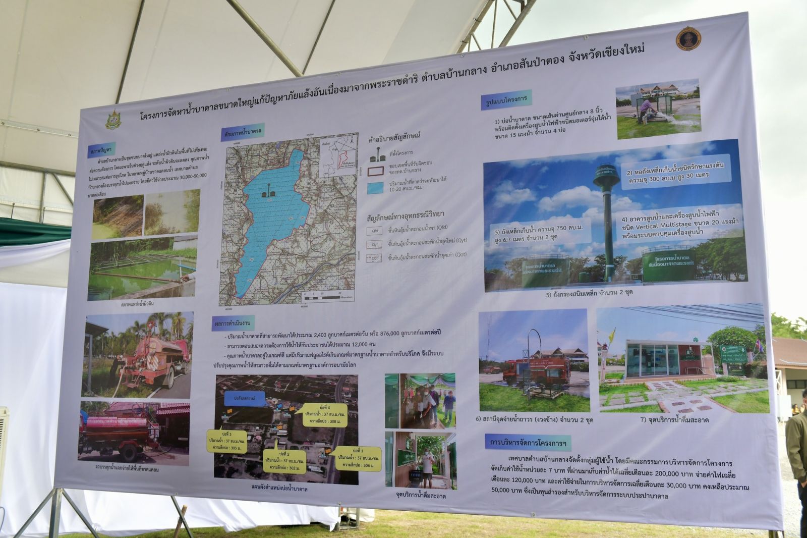 โดยปัจจุบันระบบประปาบาดาลขนาดใหญ่ของโครงการฯ มีการวางแนวท่อกระจายน้ำขนาด 10 นิ้ว ระยะทาง 1,000 เมตร สามารถจ่ายน้ำให้แก่ประชาชนได้เพียงสองหมู่บ้าน ดังนั้น เทศบาลตำบลบ้านกลางจึงเตรียมเสนอขอรับงบประมาณเพื่อต่อยอดและขยายแนวท่อส่งน้ำขนาด 8 นิ้ว ระยะทาง 13.8 กิโลเมตร ให้ครอบคลุมพื้นที่ทั้ง 11 หมู่บ้าน เพื่อเพิ่มพื้นที่ให้บริการน้ำบาดาลแก่ประชาชน และส่งน้ำบาดาลไปยังสถานที่ราชการที่มีความต้องการใช้น้ำ เช่น โรงพยาบาล โรงเรียนกีฬาจังหวัดเชียงใหม่ สถานีตำรวจภูธรสันป่าตอง และโรงเรียนสันป่าตองวิทยาคม โดยนายกฯ กล่าวมั่นใจว่าสามารถจัดสรรงบประมาณตามที่เทศบาลตำบลบ้านกลางเสนอมาได้ เพื่อต่อยอด พัฒนาโครงการฯ ให้ประชาชนสามารถเข้าถึงแหล่งน้ำที่สะอาดและมีคุณภาพอย่างทั่วถึง พร้อมกันนี้ นายกฯ ได้มอบแกลลอนบรรจุน้ำดื่ม 5 ลิตรให้ตัวแทนประชาชนแต่ละหมู่บ้าน พร้อมถ่ายภาพร่วมกับประชาชนอย่างเป็นกันเอง จากนั้นนายกฯ ได้เปิดวาล์วน้ำให้กับรถบรรทุกน้ำ เพื่อนำน้ำที่มีคุณภาพและมีมาตรฐานไปแจกจ่ายให้กับประชาชนในพื้นที่ที่ยังเข้าไม่ถึงแหล่งน้ำสะอาด ก่อนที่นายกฯ และคณะจะเดินทางไปยังศูนย์หัตถกรรมไม้แกะสลักบ้านถวาย อำเภอหางดง จังหวัดเชียงใหม่ ต่อไป