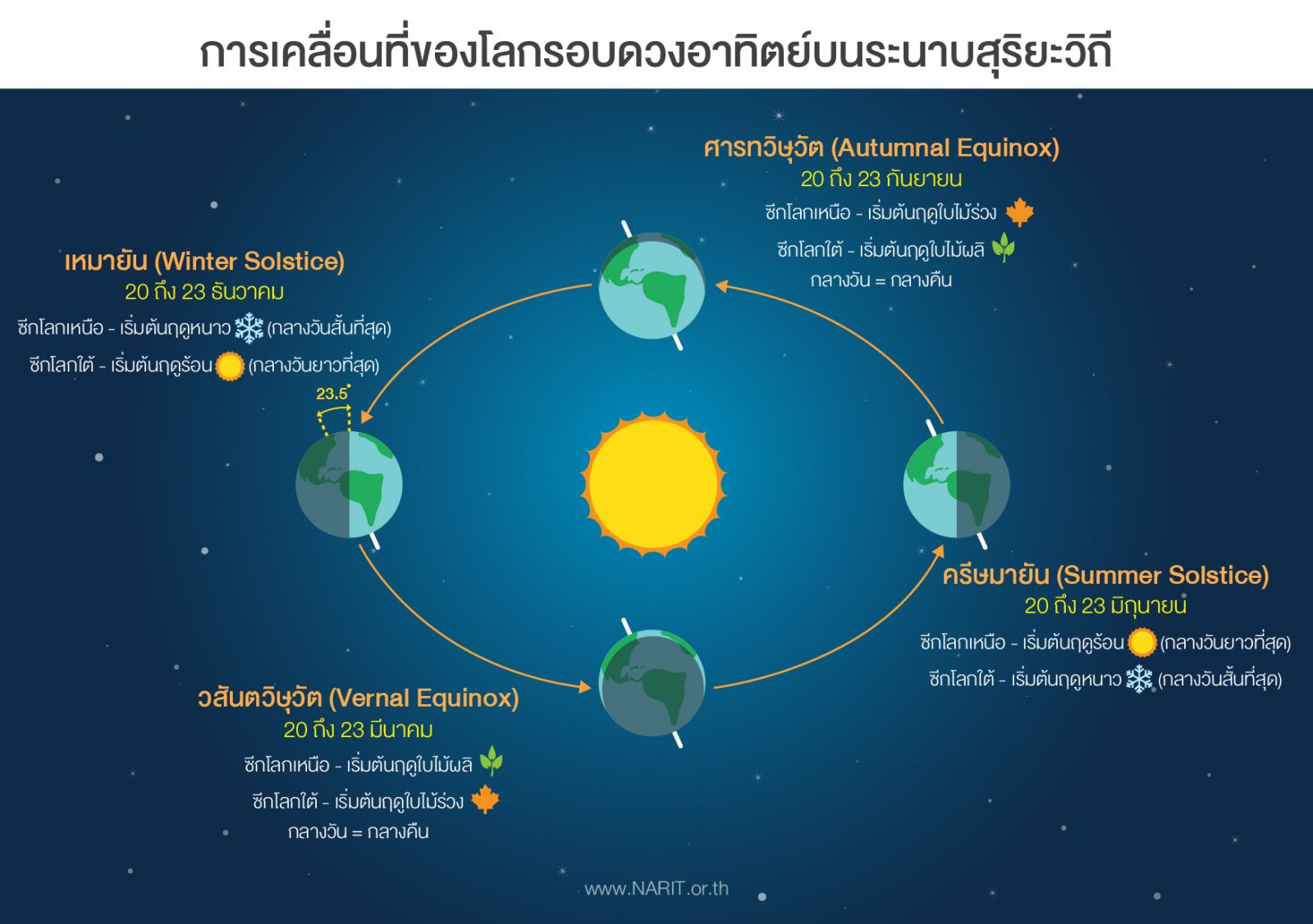 สำหรับ “ฤดูกาล” เกิดจากแกนโลกเอียงทำมุม 23.5 องศา กับแนวตั้งฉากกับระนาบโคจรของโลกรอบดวงอาทิตย์ ทำให้พื้นที่ต่าง ๆ ทั่วโลกได้รับแสงอาทิตย์ในปริมาณไม่เท่ากัน ส่งผลให้มีอุณหภูมิต่างกัน รวมถึงระยะเวลากลางวันและกลางคืนก็ต่างกันด้วย เหตุนี้ทำให้เกิดฤดูกาลขึ้นบนโลกนั่นเอง จะสังเกตได้ว่าในฤดูร้อนดวงอาทิตย์จะขึ้นเร็วและตกช้า เวลากลางวันจะมีระยะเวลายาวนานกว่ากลางคืน แตกต่างกับฤดูหนาวที่ดวงอาทิตย์จะขึ้นช้าและตกเร็ว เวลากลางคืนจะมีระยะเวลายาวนานกว่ากลางวัน